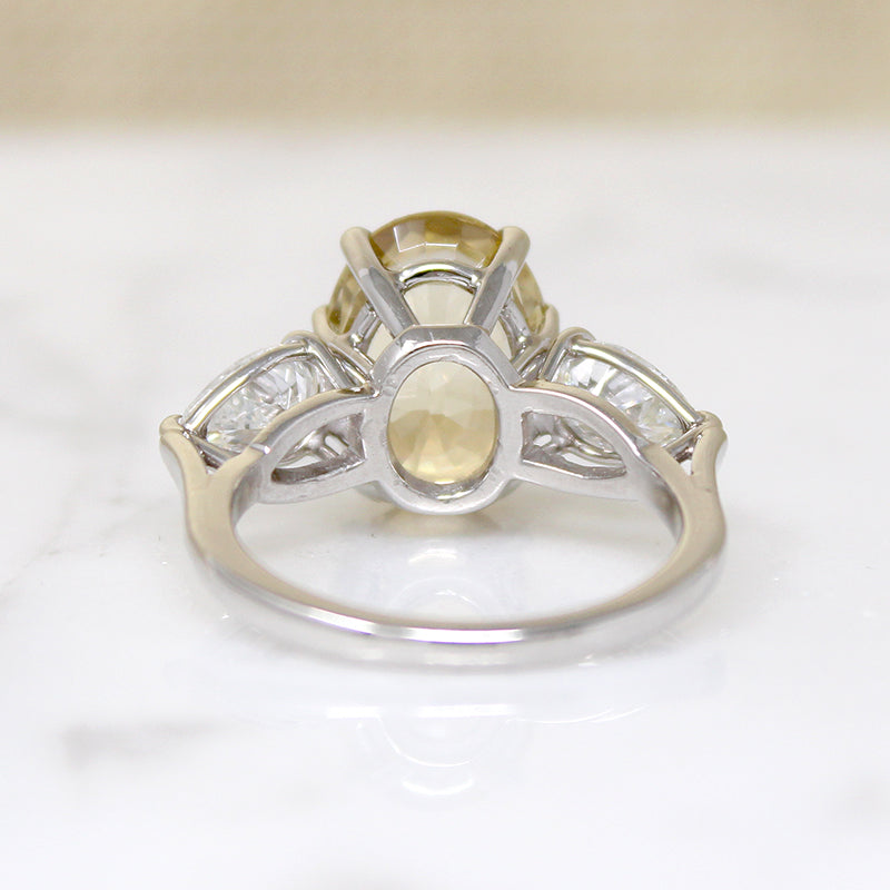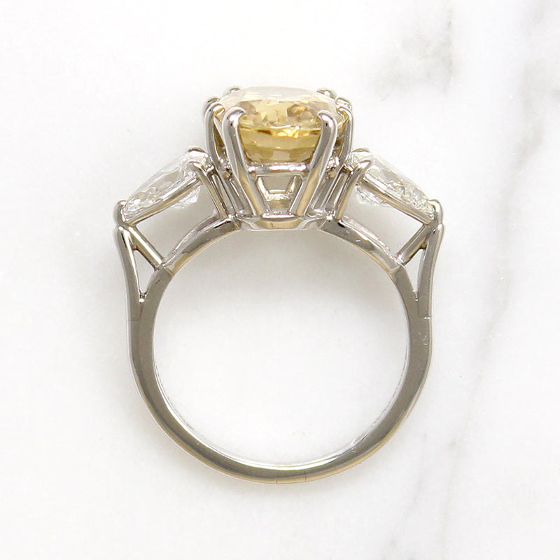 Gem Details.....The oval faceted zircon weighs 6.18ct, with Eye-clean clarity. and Medium, Very Slightly Brownish, Yellow (Y 5/3) color. Two pear shape brilliant cut diamonds weigh .69ct each for a total weight of 1.38ct, with S1 clarity and G-H color.