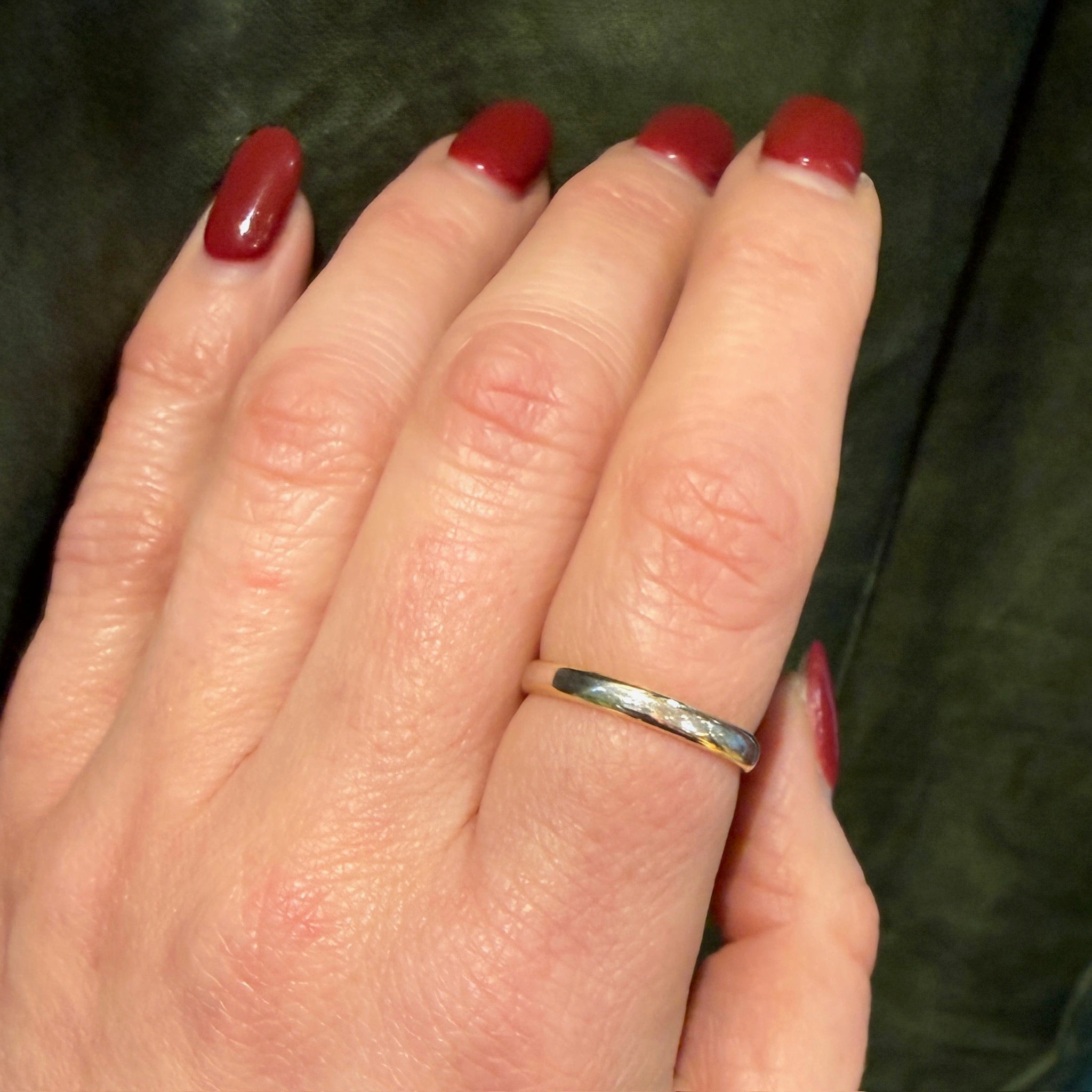 This unusual wedding band is made of 14k yellow gold with a band of silver in the middle. It is quite rare, dated 1941 when the use of Platinum was reserved for war use only, they got creative with white metals.