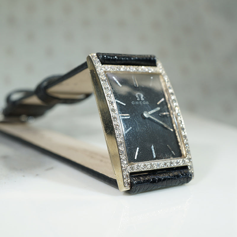 An elegant vintage Omega wristwatch of 14k gold and diamonds. The rectangular gold case displays a black face under a subtly curved crystal. Tiny diamonds are set along the edges of the case. The watch is on a handsome band of black Italian lizard. It is in good running condition: this mechanical watch keeps time. Circa 1940.