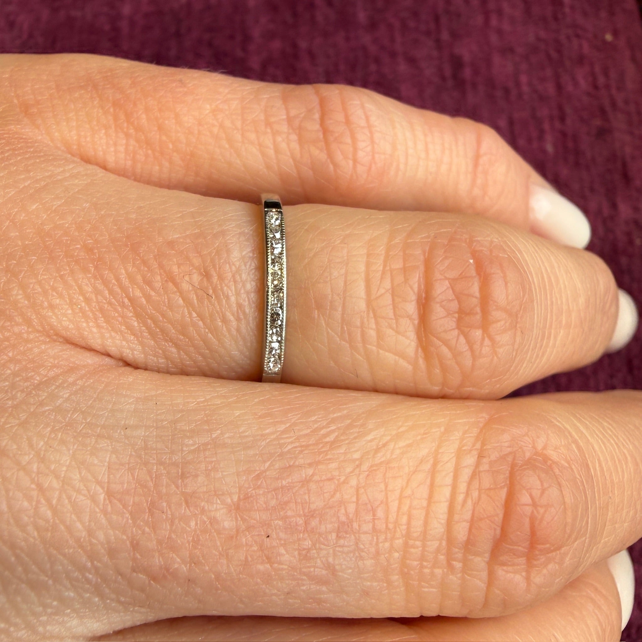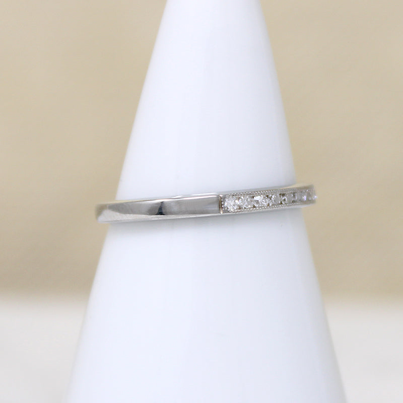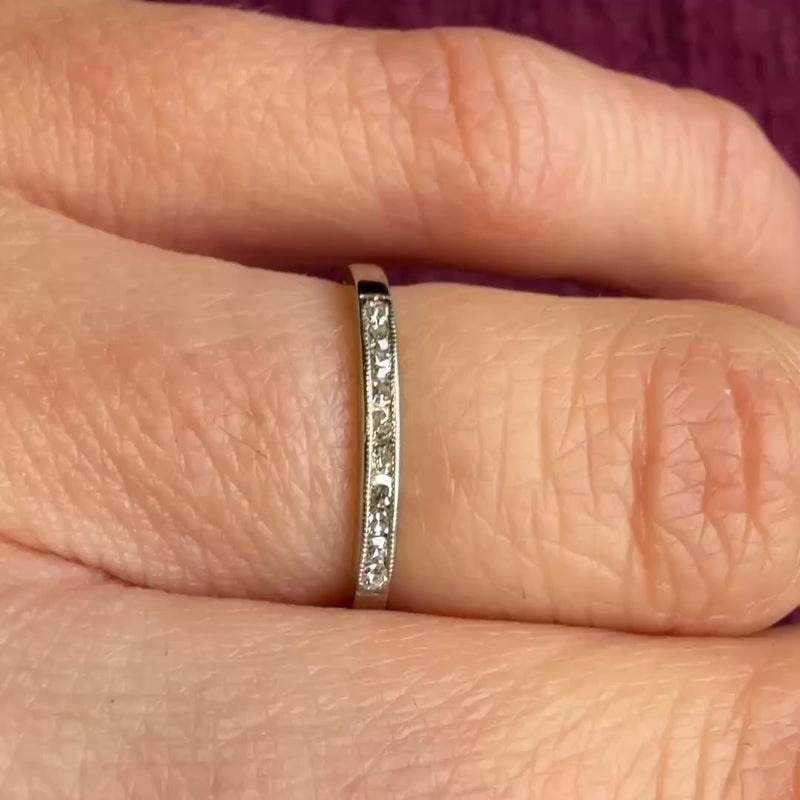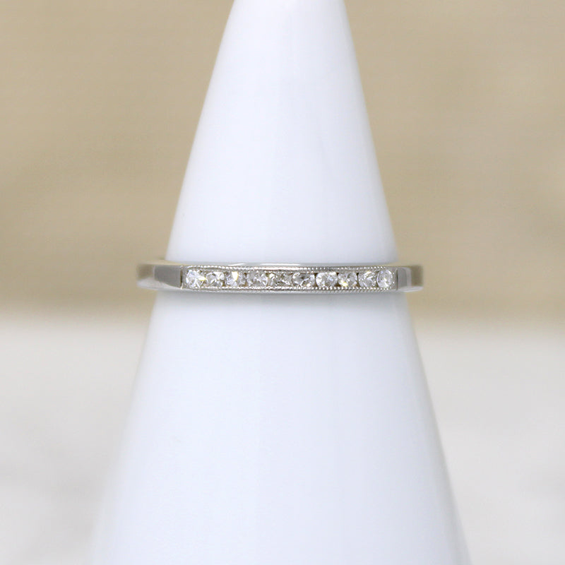 A dainty diamond wedding band, with a row of tiny twinkly stones channel-set in 18k white gold. Delicate milgrain runs along the channels, adding to the glitter. This band's delicate proportions make it the perfect match for many vintage engagement rings, its low profile and flat edges allows the piece to tuck under a raised center stone. Circa 1930.