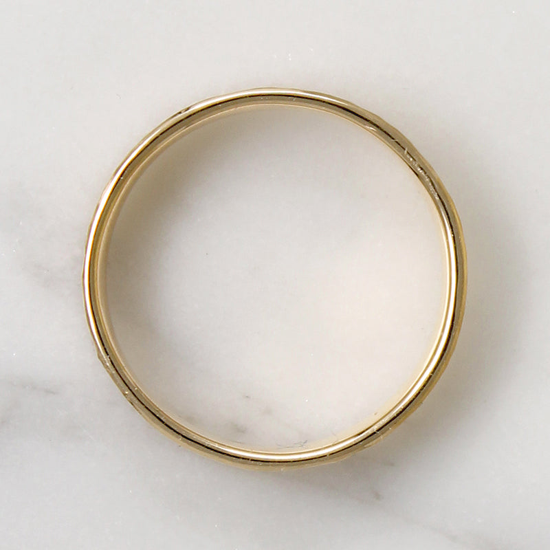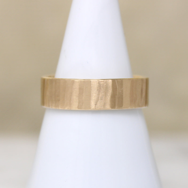 This vintage 14k gold wedding ring has an interesting finish. The wide, flat, comfort fit band is faceted with long, vertical planes and brushed to a satiny glow. It's a stylish look in a very popular size.