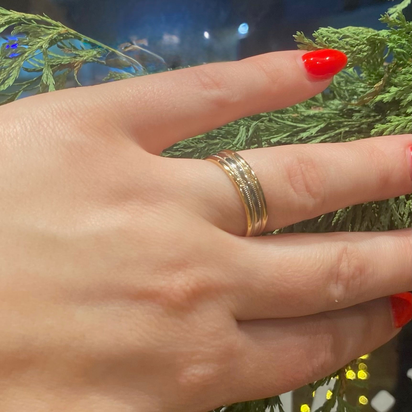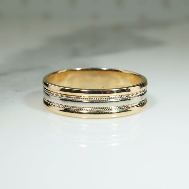 A two-tone 14k gold wedding band with handsome embellishments. A wide, flat, yellow gold band is overlaid with a ring of white gold that girds its middle. The yellow gold edges are raised, while the white gold ring is framed in crisp milgrain beading. The interior of the band is marked "14k TW" for Tessler & Weiss. This one is a unicorn, with so many wonderful features in a very high-demand size. It's in great condition, too. Circa 1960.