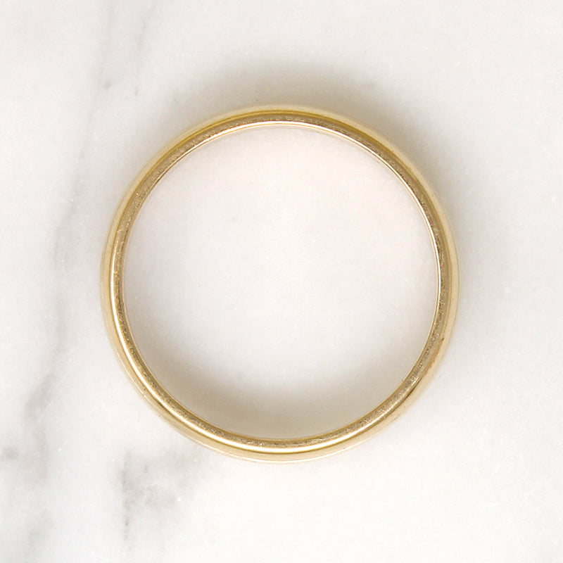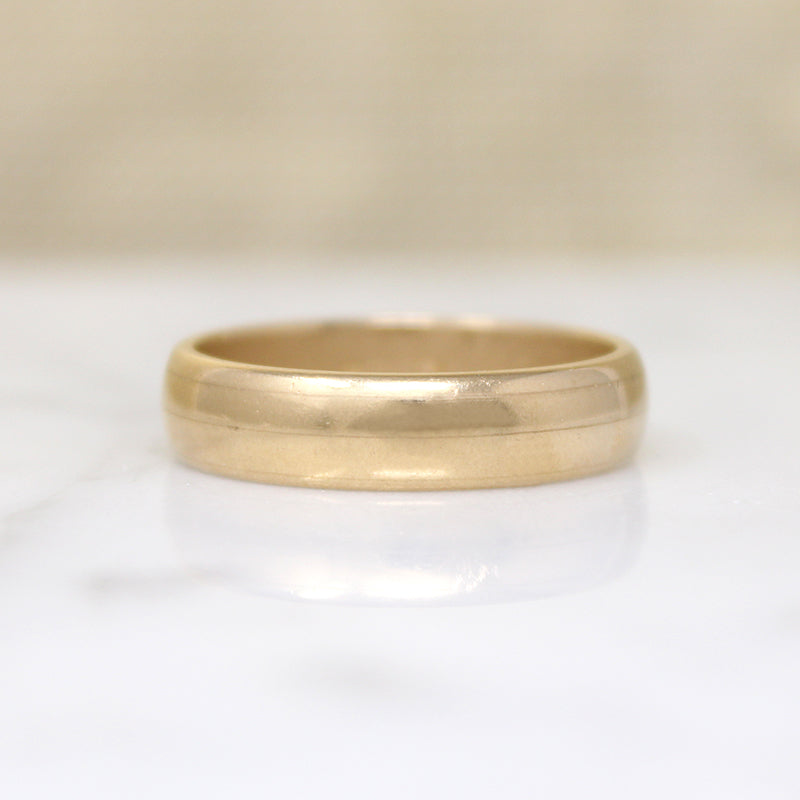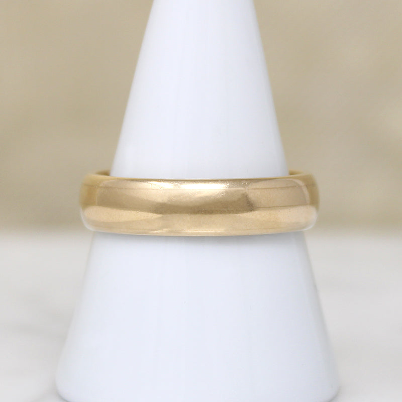 A heavy half round wedding band in our most popular men's finger size and width. The glossy 14k gold ring has lovely soft edges and a satisfying weight. Classic quality. Circa 1950.