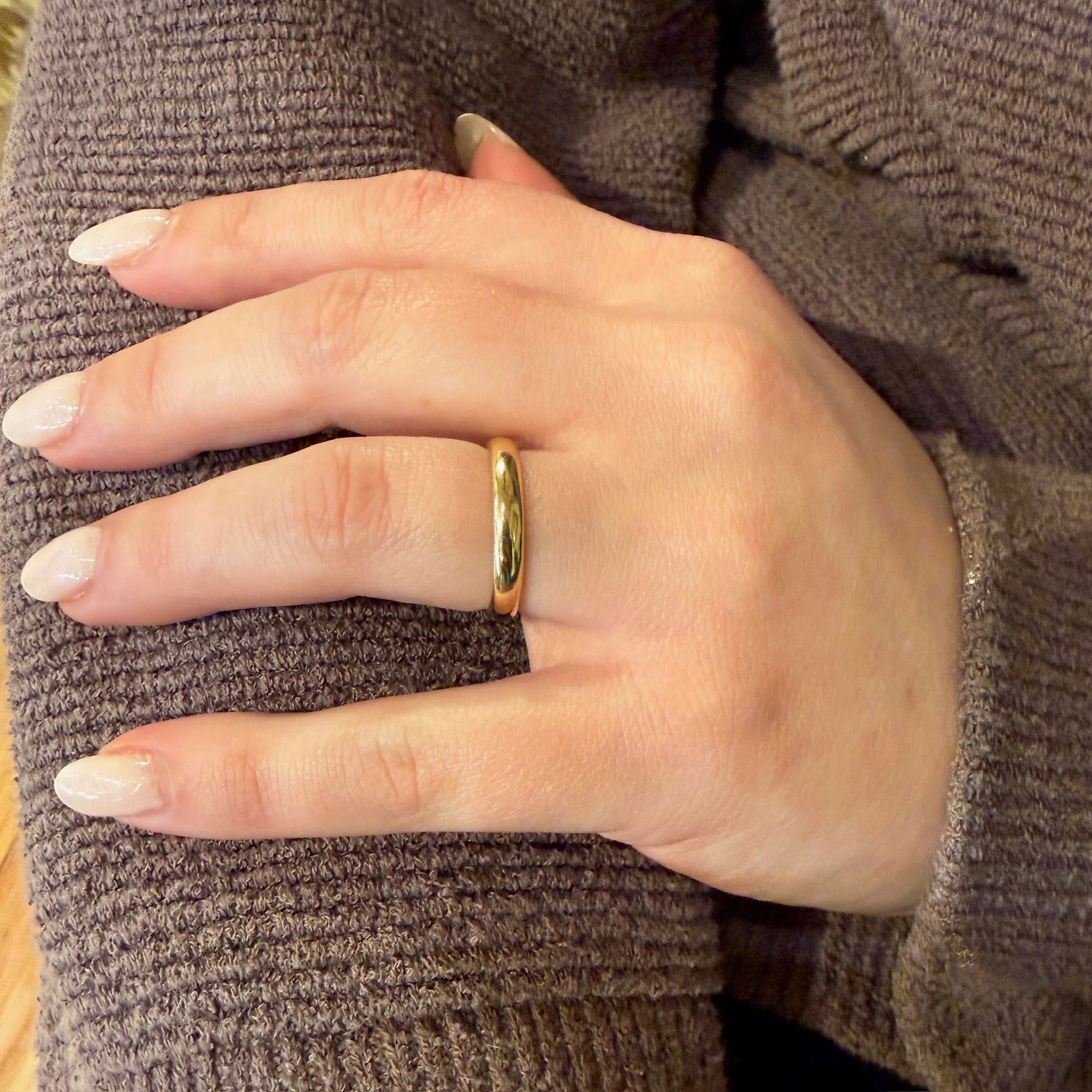 A slim 14k gold wedding ring with a half round exterior and a slightly curved interior, quite comfortable on the hand. The ring bears a handsome marker's mark, "H. Lewkowitz," and a worn engraved name that reads, perhaps, "Banys?" A vintage band of this size and width is always in high demand, get it while it's hot. Circa 1930.
