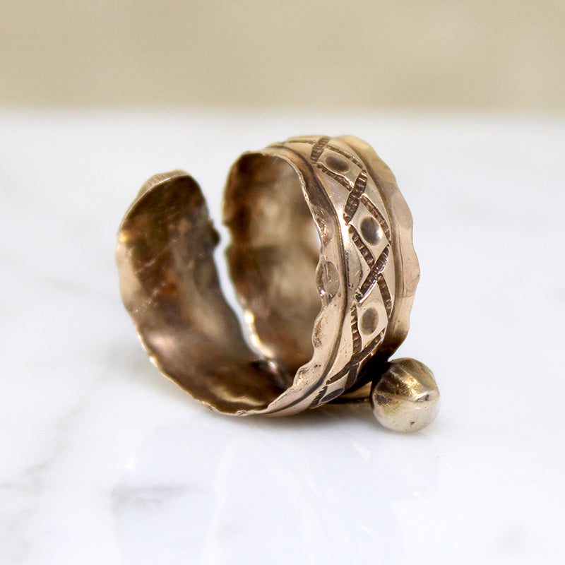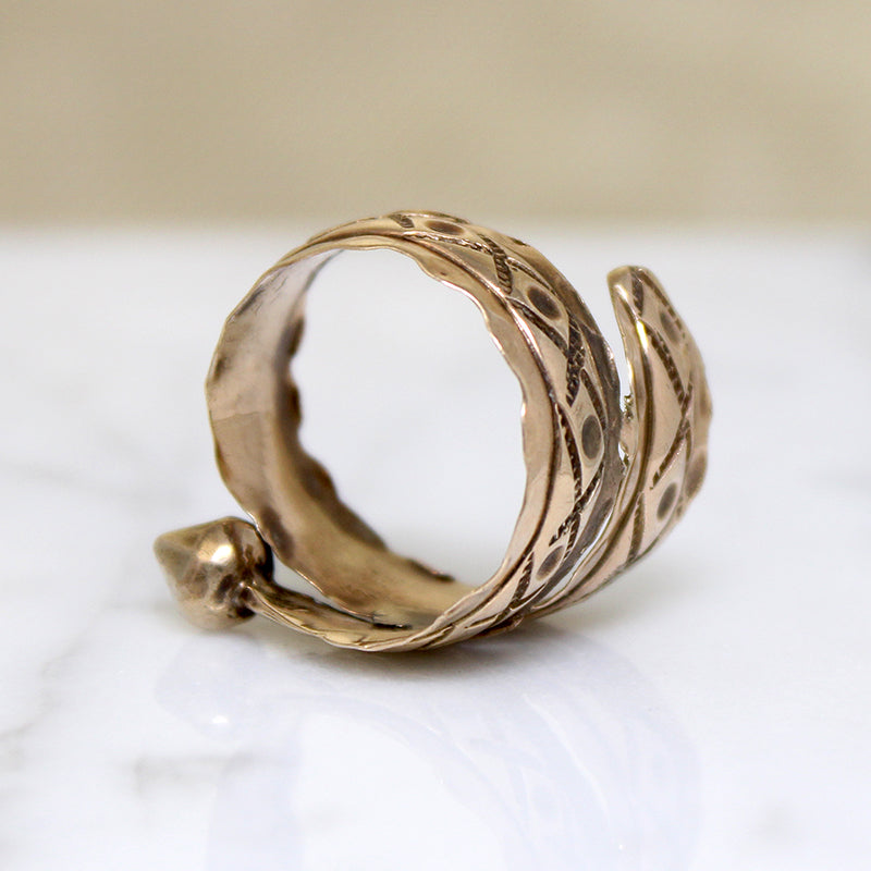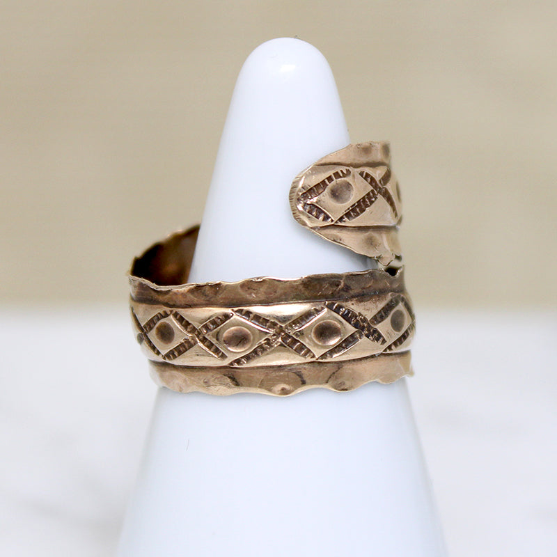 This strange, stylized snake ring is a coiled band. The early Victorian piece is a strip of 12k gold, engraved with a graphic scale pattern. His blunt little head nuzzles against the finger. In the 19th Century snakes were popular symbols of eternal love. You are sure to love this affectionate little snake. He already loves you. Circa 1840.