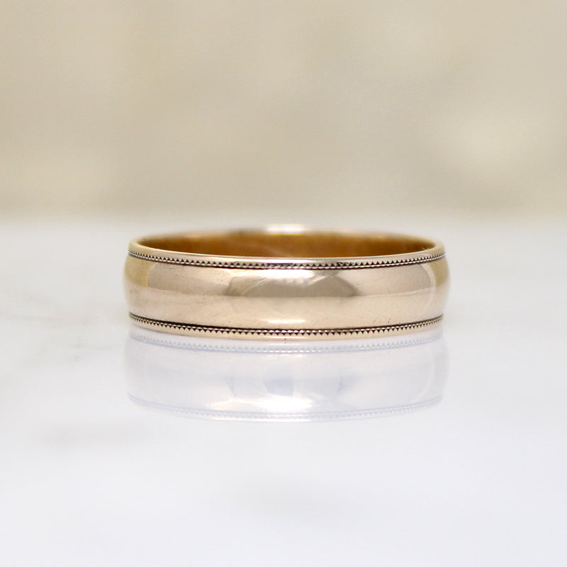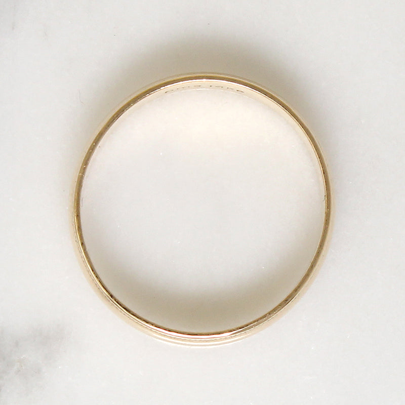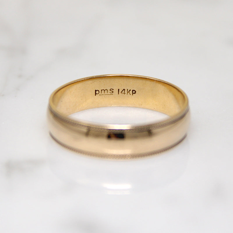 A stylish 14k gold wedding band with milgrain edges. The band has a half round exterior and a flat interior, making it lightweight and easy to wear. The interior is marked "PMS 14KP." The Plumb mark on gold indicates the piece is plumb, meaning the gold purity is exact. Circa 1970.