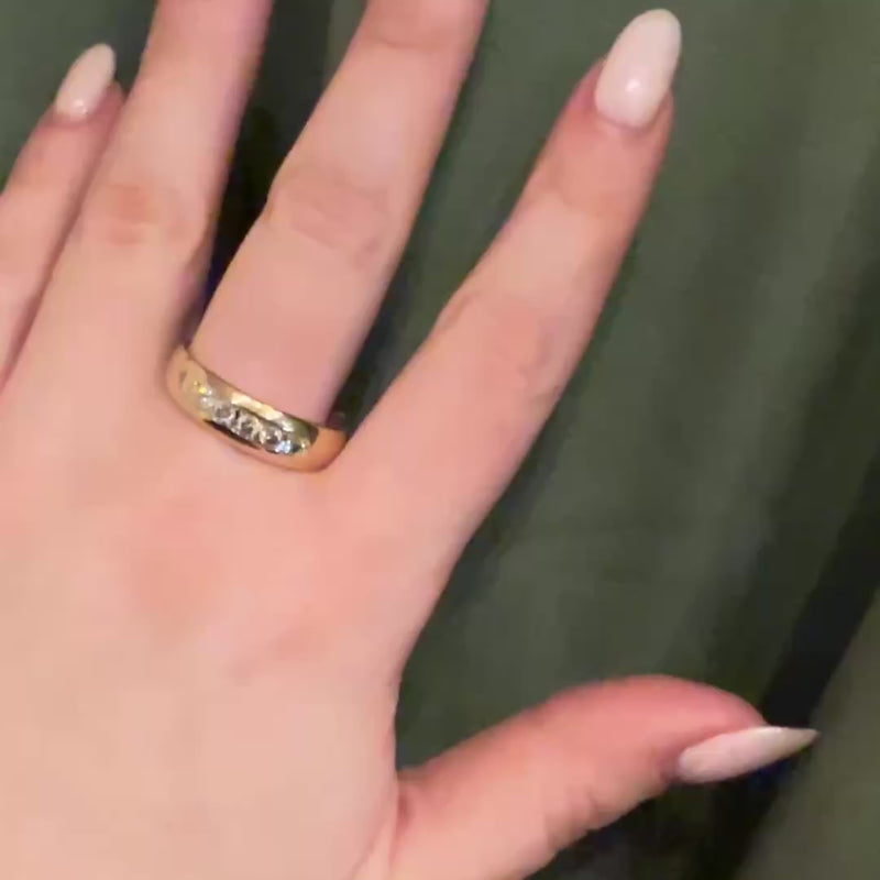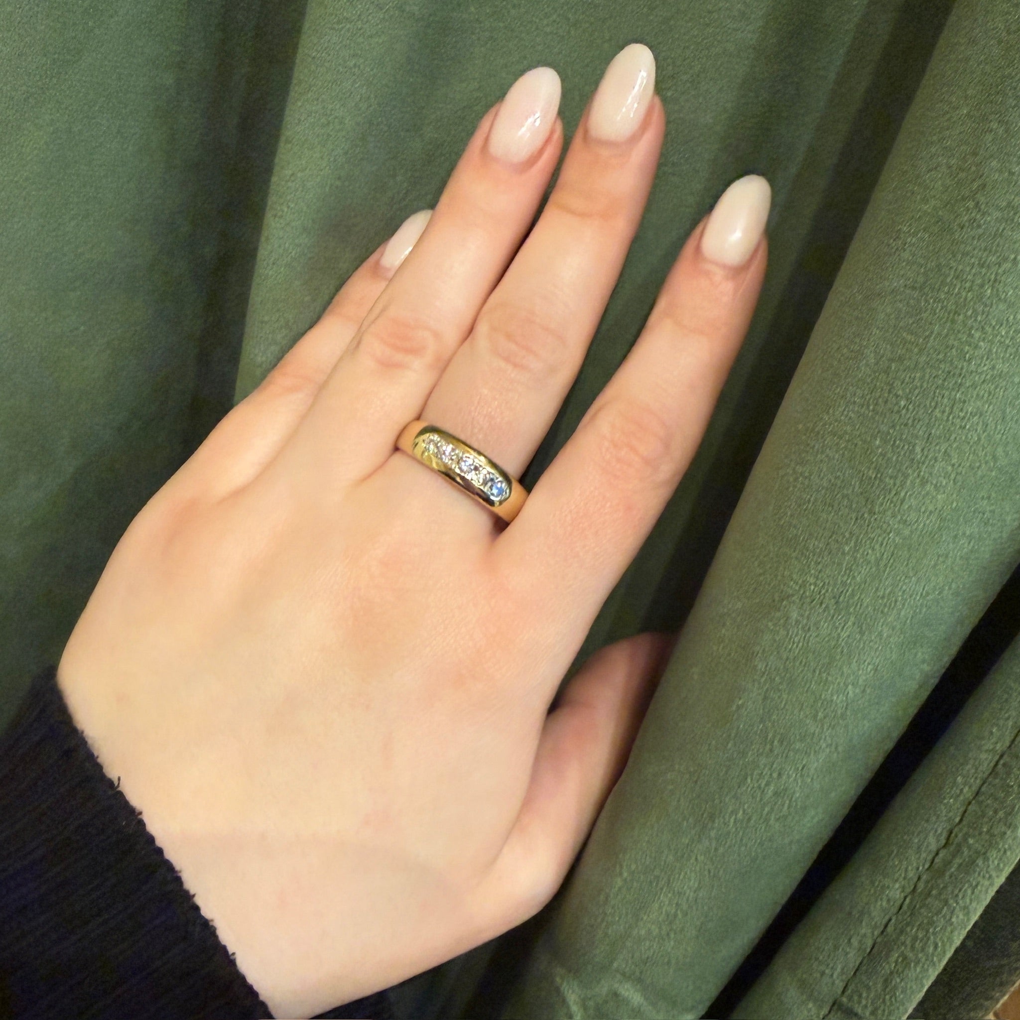 This tasteful gypsy-style diamond band is a Mid Century gem. The 14k gold band is a soft, tapered half round. Five diamonds are inset across the top of the ring, bead-set in crisp white gold. The bright and sparkling stones have a .40tcw. Glossy gold and glittering diamonds, we rarely find a luxurious ring like this in a large size. Circa 1970.