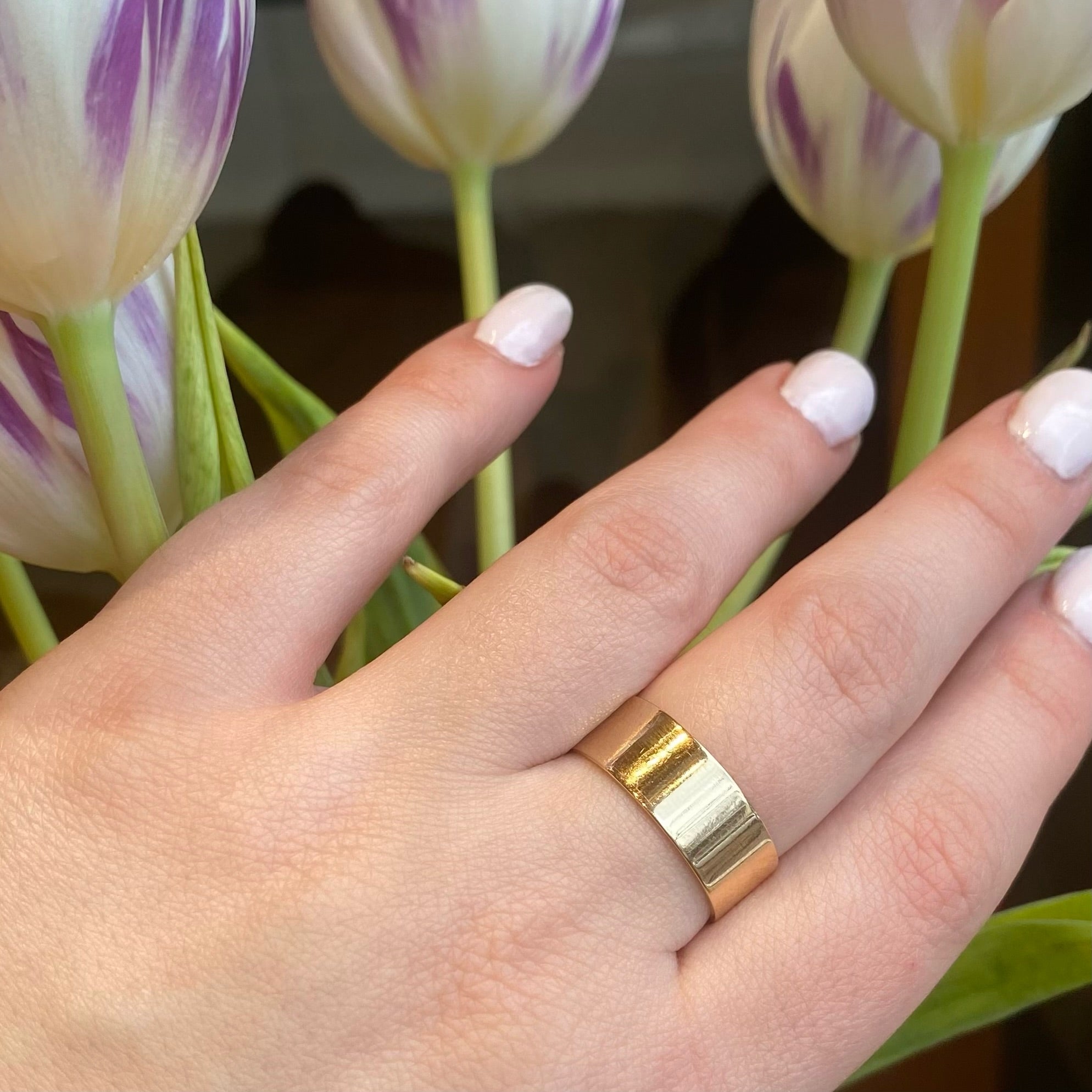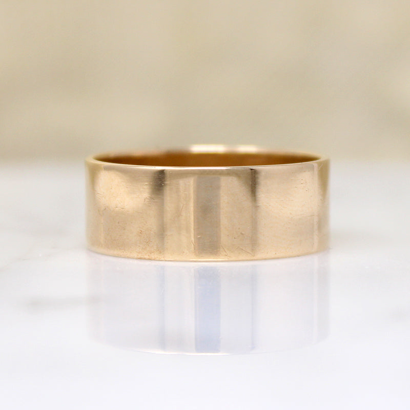 Details.....Currently a size 10.75. The band measures 8.2mm wide. Please remember, a band this wide will fit more tightly that a typical size 10.75. In Very Good Vintage Condition. You should always expect some wear on vintage and antique jewels; we consider it part of their charm.