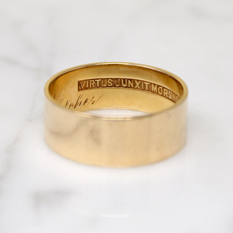 This fantastic 14k gold wedding band has a lot to say. The Deco era band is flat and quite wide, just as bright and glossy as you could as for. Its interior is stamped with the legend "Virtus Junxit Morsnon Separabit," Latin for "What virtue has united, death shall not separate.” This is the motto for the 14th Degree of the Scottish Rite of Freemasonry; it's often inscribed on a ring, symbolizing a bond that is unbreakable even by death. The ring is also hand engraved with the personal inscription "Nov. 7 1921 Thomas Cussoms Fletcher." This is a very special ring in a very sought after size.