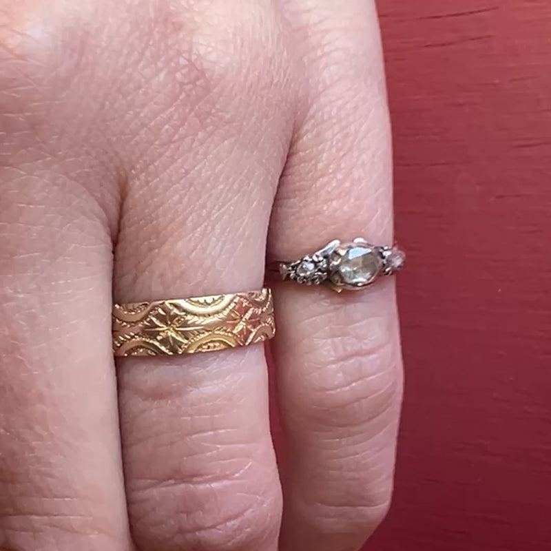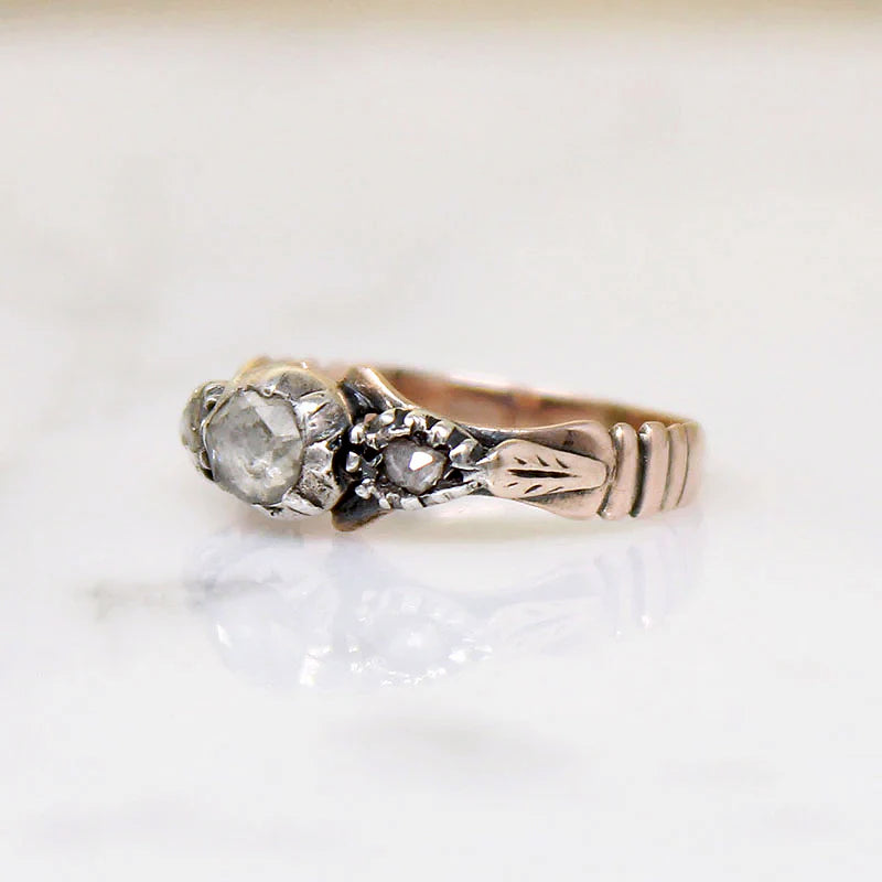 A petite Georgian ring set with glittering rose-cut diamonds. The oval center diamond sits in a silver pie crust setting, a style common to the era. Two small diamonds flank the center stone, each set in engraved silver. The diamonds and silver were applied to the ring's 14k rosy gold band. Split cathedral shoulders are sculpted and engraved with a delicate foliate design. The diamonds are foiled and closed-backed. Prior to the mid-1800s gems were commonly backed with foil enhancing their sparkle in the low light conditions that existed before modern electric lighting. Circa 1780.