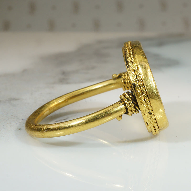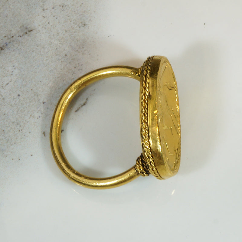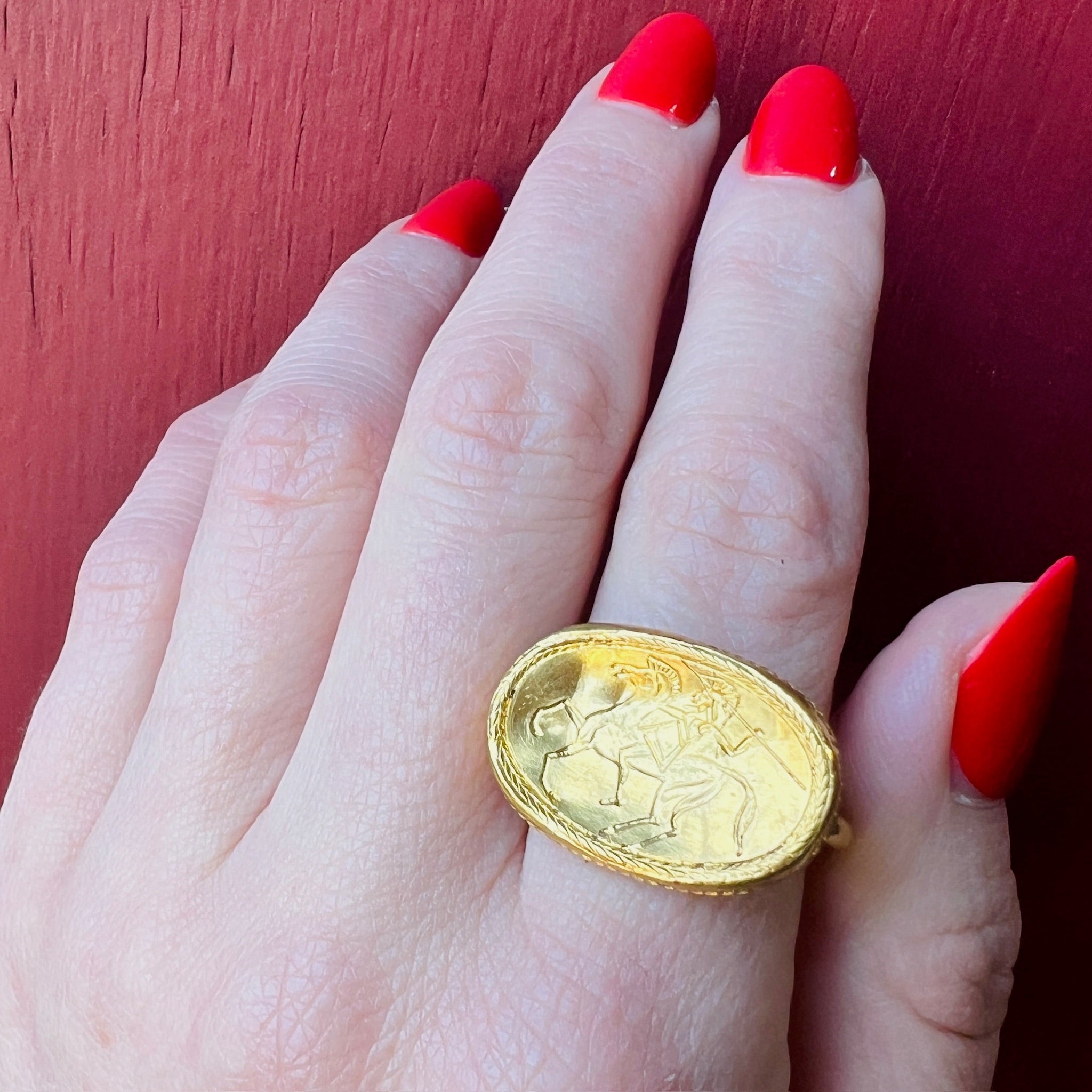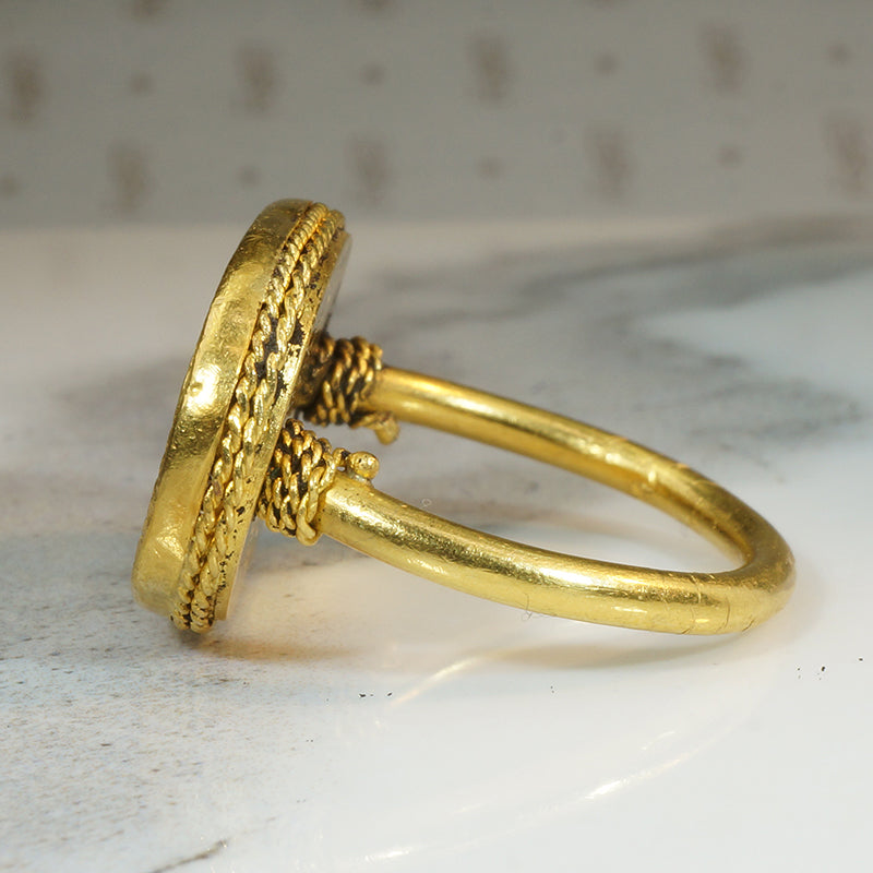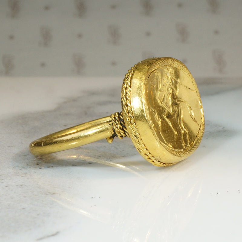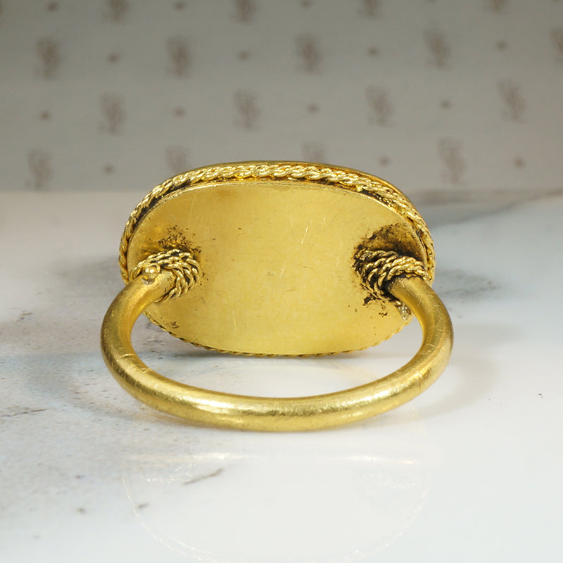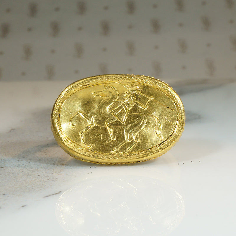 This ring is made of 22k gold. The gentle concave of the surface is hand engraved with a Roman soldier on horseback, holding a spear. The carved surface is set in a bezel hand engraved with an arrow pattern. The outer edge of the setting has a double twisted wire embellishment, pairing beautifully with the twisted wire at the shoulder of the half-hoop style band. This ring tests as 22k gold and has all the softened edges and tiny dings I love in antique high karat gold. While this ring is difficult to date, as the techniques used to make it have been in use for many hundreds of years, I believe it is from the Archaeological Revival period of the mid 1800s.