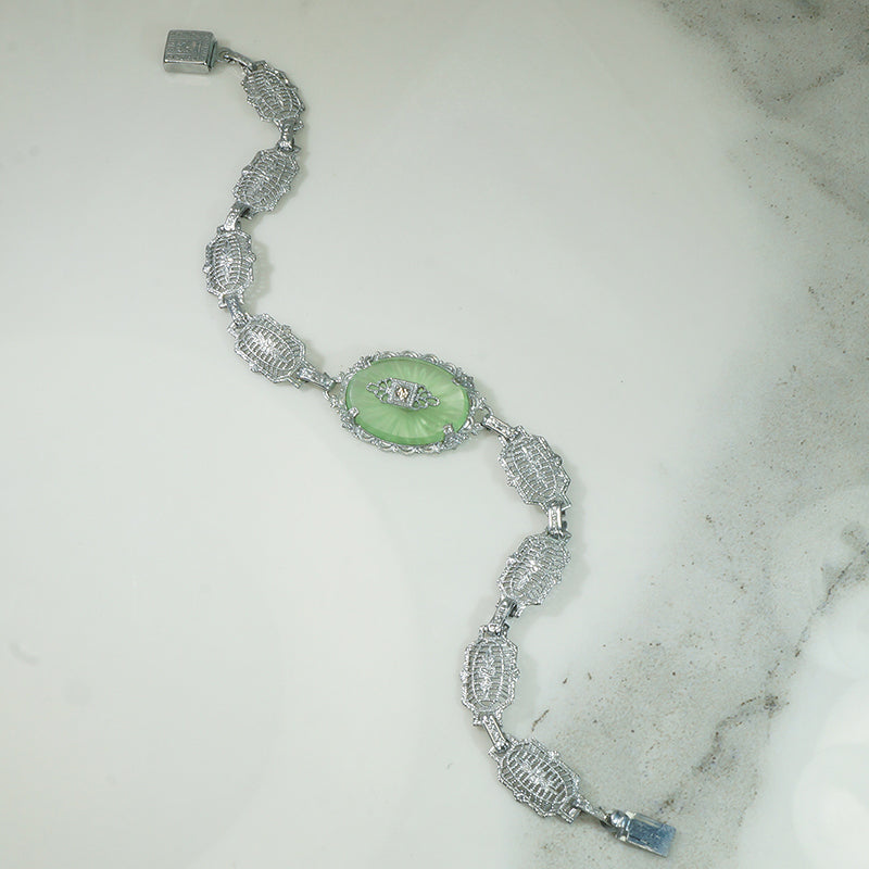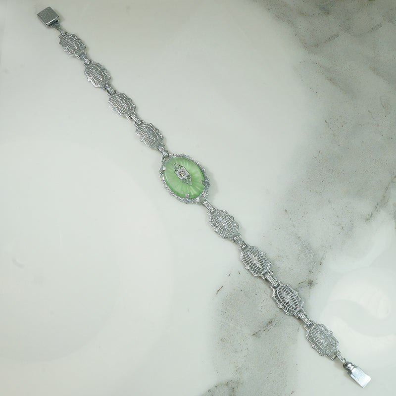 This chrome filigree Art Deco Bracelet has its original detailed clasp. The center panel is set with a mint green camphor style glass which likely glows under a black light. Circa 1920.
