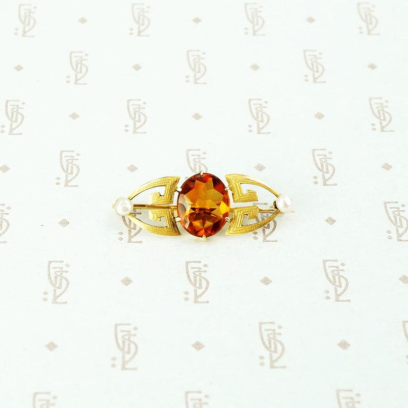 This brooch holds one of my favourite gem cuts: the buff top. The buff top gem has an interesting and varied facet pattern on the bottom and a polished, slightly domed, un-faceted top. This cut works particularly well on translucent gems as the bottom facets show nicely through the smooth surface. This yellow gold Arts & Crafts brooch is set with a rich orange-yellow citrine, and has halved and drilled river pearls set on each end of the design. Marked for 14k, circa 1910.