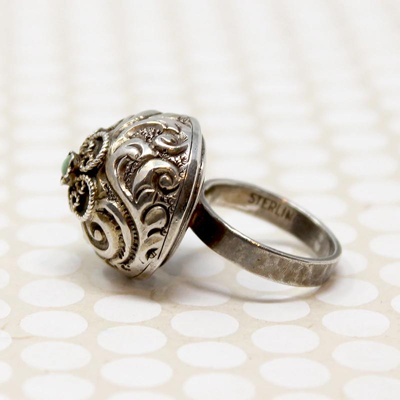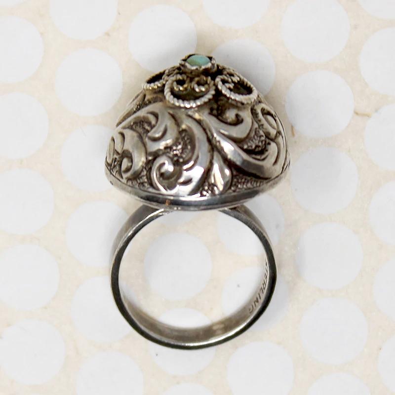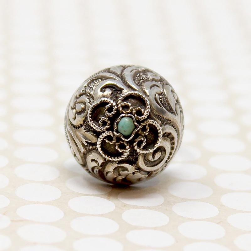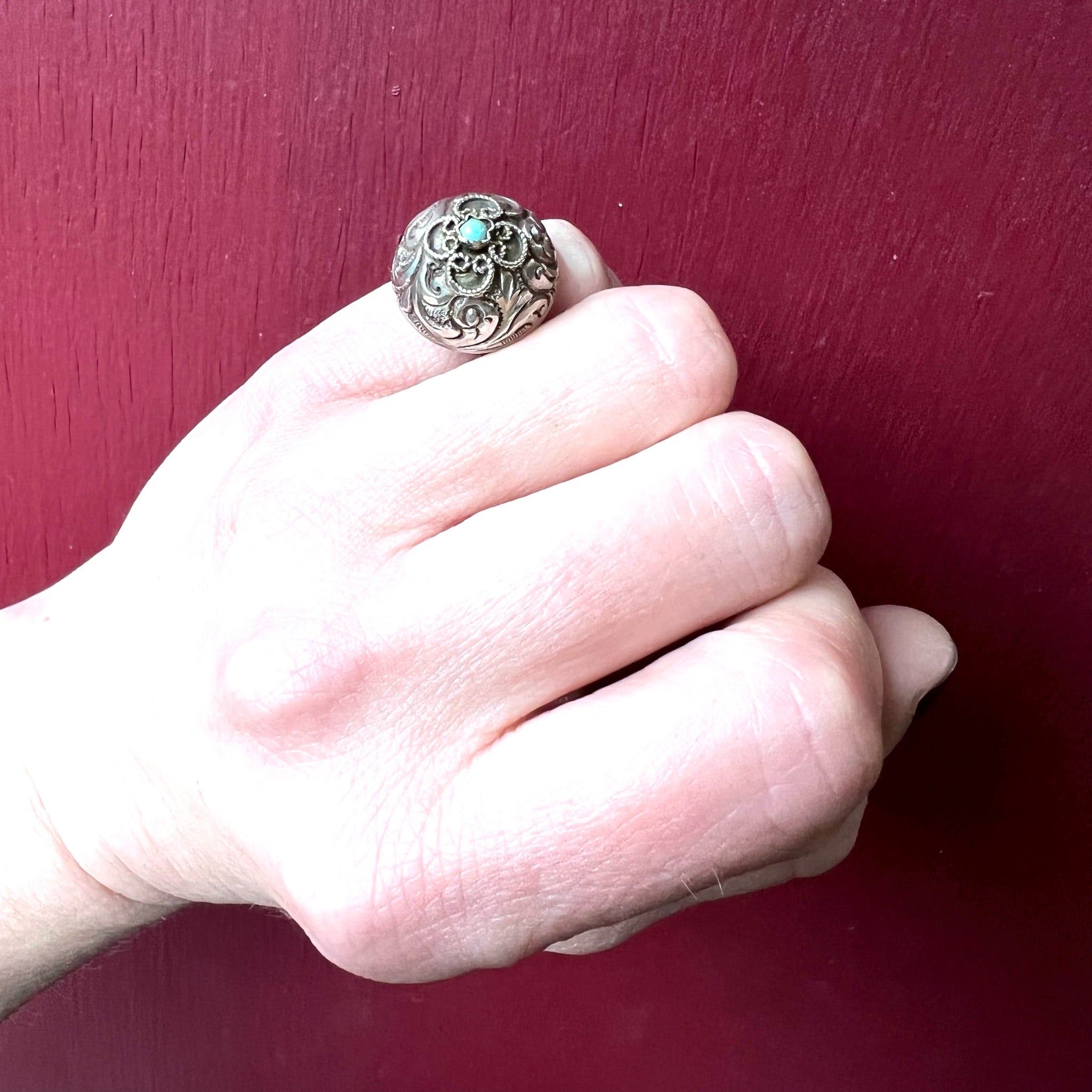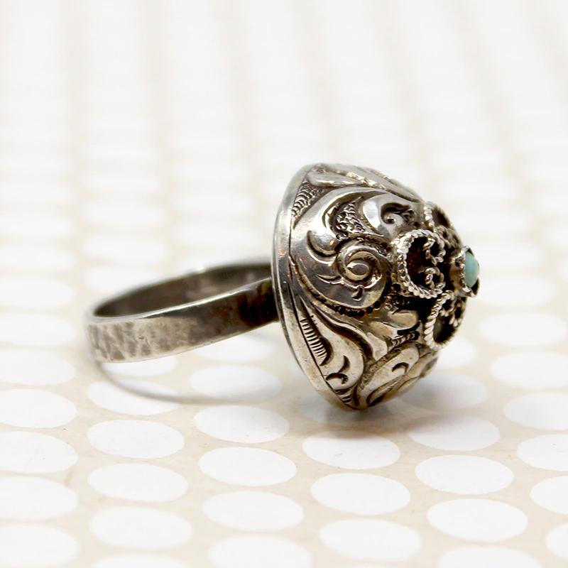 This Bedouin-style ring has a dramatic, bohemian look. An ornate sterling silver dome sits on a narrow, flat hammered band. A repoussé foliate pattern covers the dome. A small turquoise sits atop, framed by petals of wirework. With its proud profile, this ring makes a bold, romantic statement. Circa 1960.