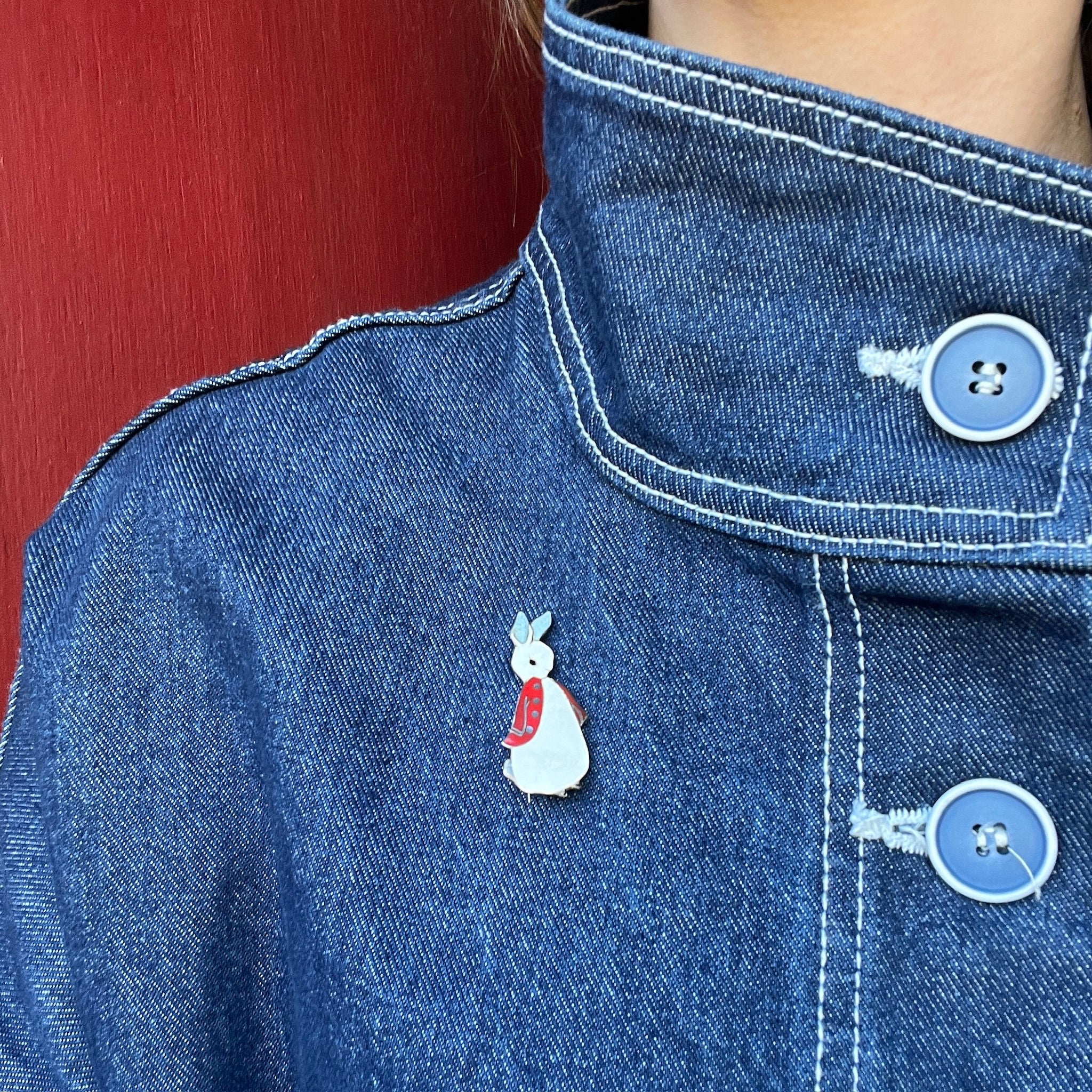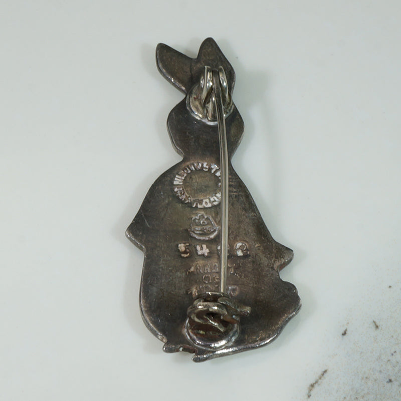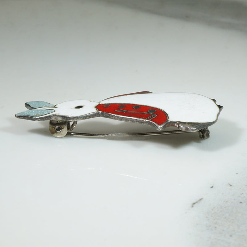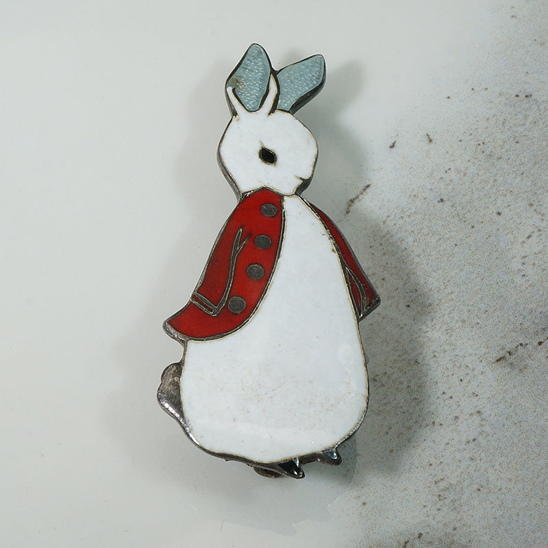 A chubby little bunny brooch from Margot de Taxco. This sweet rabbit looks a lot like Beatrix Potter's character Flopsy Bunny. Silver, red, and white champlevé enamel is applied to sterling silver; she wears a little red coat over her fluffy white fur. She is adorable, with a shy face and tiny shoes peeking out from under her chonky belly. This brooch fastens with a security clasp. The back is stamped "Margot de Taxco," "Made in Mexico Sterling," and the Mexican Eagle 16 sterling mark. It is also marked with the design number 5422. Margot de Taxco designs were numbered 5100 to 5790, so this is her 322nd design. This piece was made around 1948, at the height of her career.