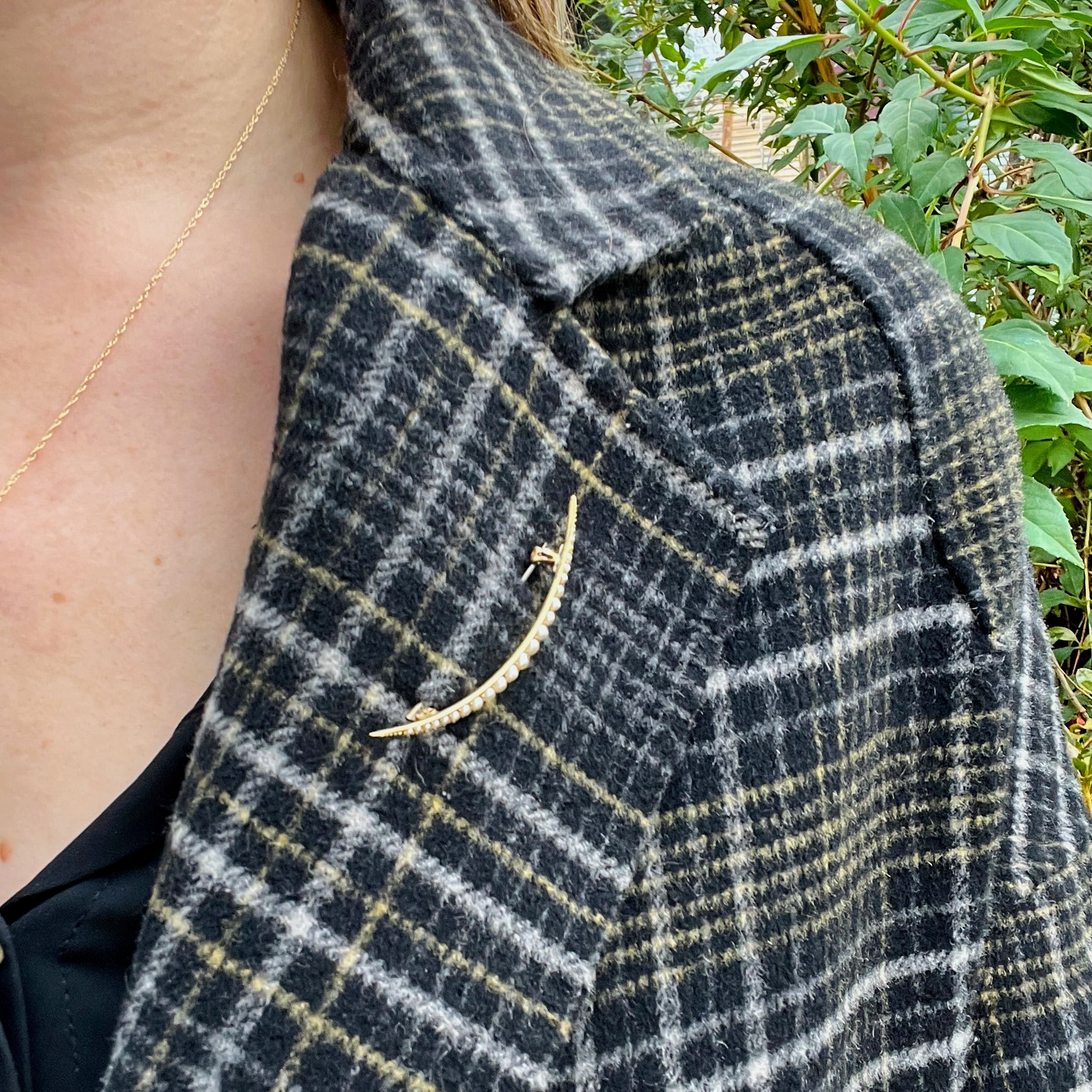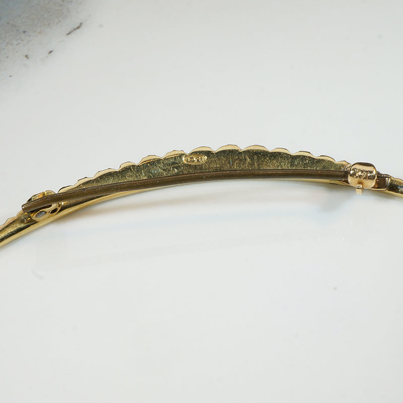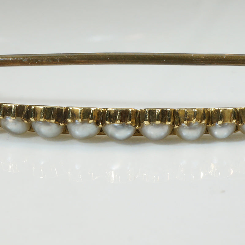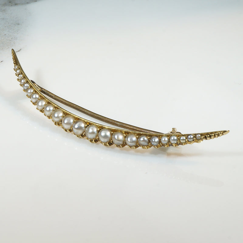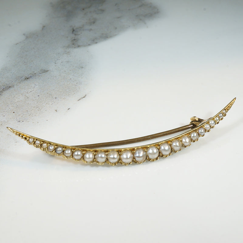 The last decade of the 19th Century brought symbolism and mysticism into every area of life as people contemplated the new century and what it might bring. Moons, stars, comets, and other heavenly phenomena were popular motifs in clothing and jewelry. This delicate sliver of a crescent moon brooch is crafted of rich 15ct gold, with a graduated curve of natural pearls set in fancy collets. A gold band forms the crescent's inner arc, while the collets create the scalloped outer edges. Engraved beaded detail embellishes each end of the crescent. The dreamy piece fastens with a long pin and security clasp. Circa 1910.