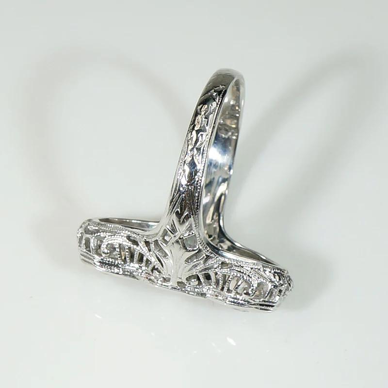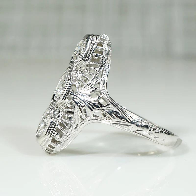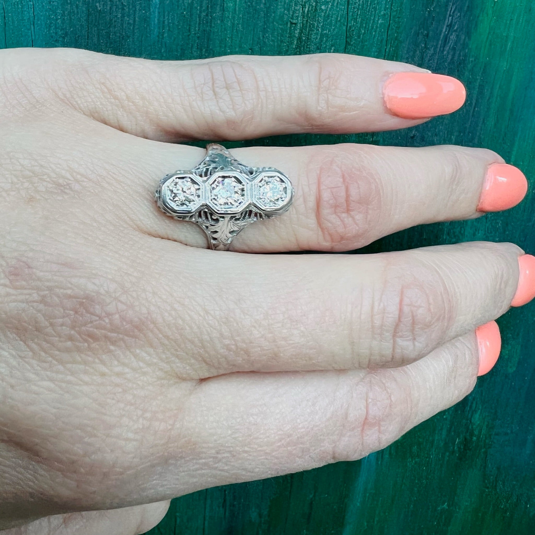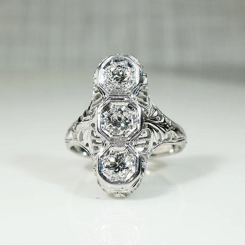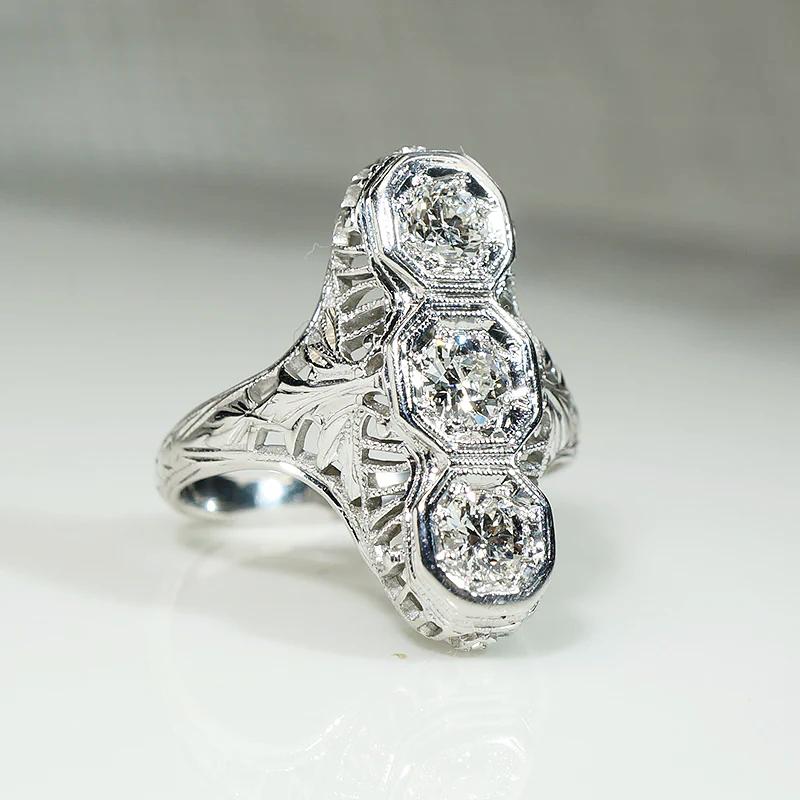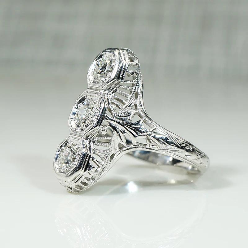 Three sparkling diamonds are set vertically in this fascinating Art Deco knuckle ring. Each diamond is set in its own engraved hexagon within an 18k white gold ring. The pretty diamonds have a total weight of .75 carats. The puffy gallery and shoulders are filigreed with ornate piercing and lacy metal work, and the decorative shoulders taper into a slim, engraved band. This enchanting ring has a powerful presence, with all the glamour of this dramatic era. Circa 1920.