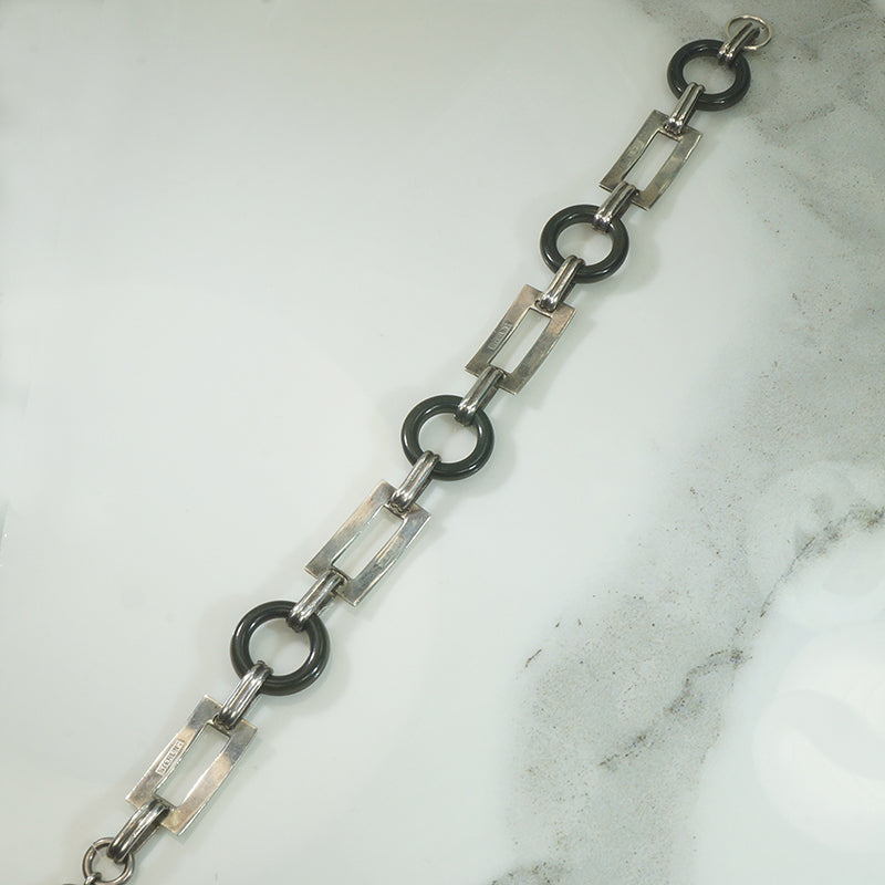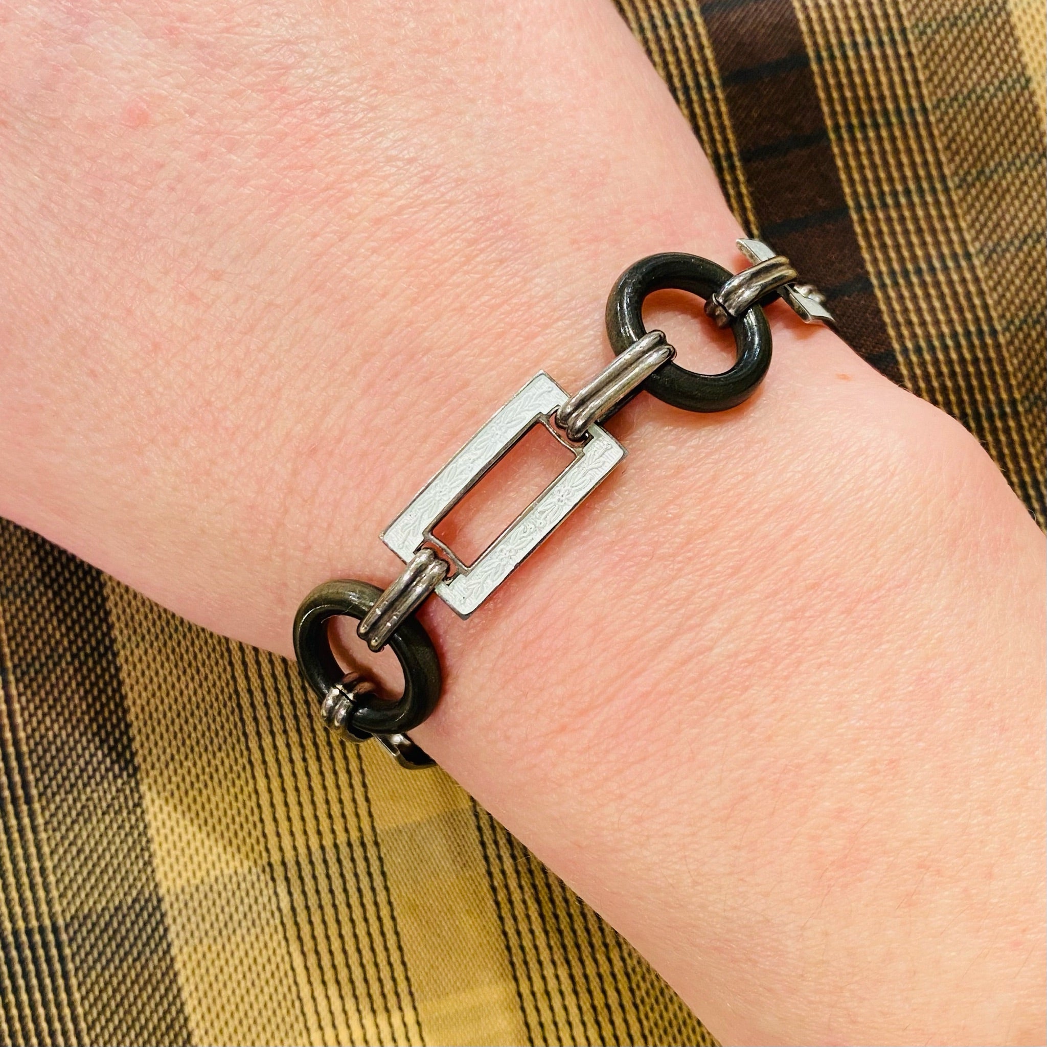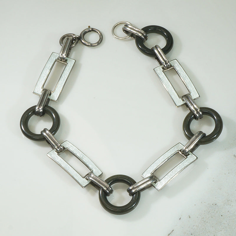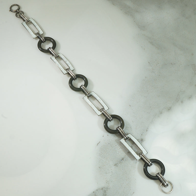 Dark grey celluloid rings connect rectangular white guilloché links to form a very Art Deco Bracelet. Sterling silver circa 1920.
