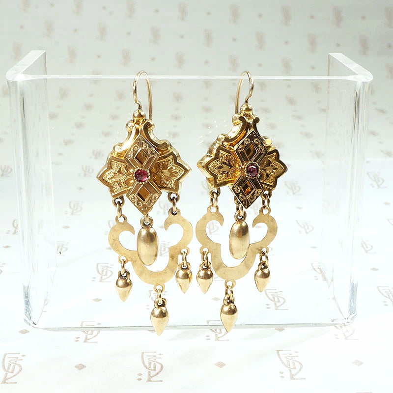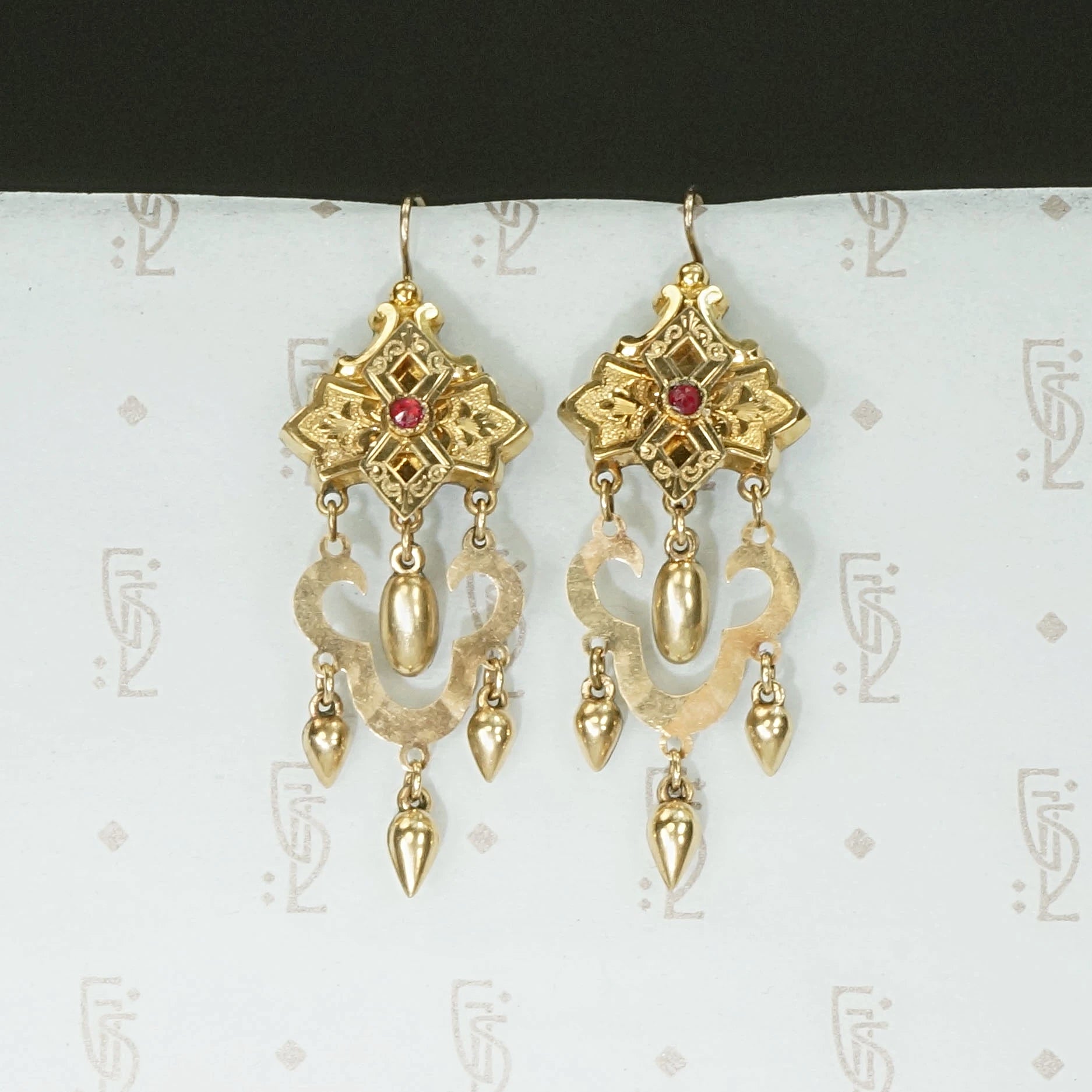 During the middle of the Victorian era, fashion developed an enthusiastic interest in Middle Eastern art and design. These wonderful gold filled chandelier earrings are a delightful example of that influence. Three dimensional tops are elaborately engraved and embellished with tiny rubies. Delicately curling festoons and four pendulums are suspended from the tops; they are thoroughly articulated and have a great deal of graceful movement. The ear wires are 14k gold. Circa 1860-1870.