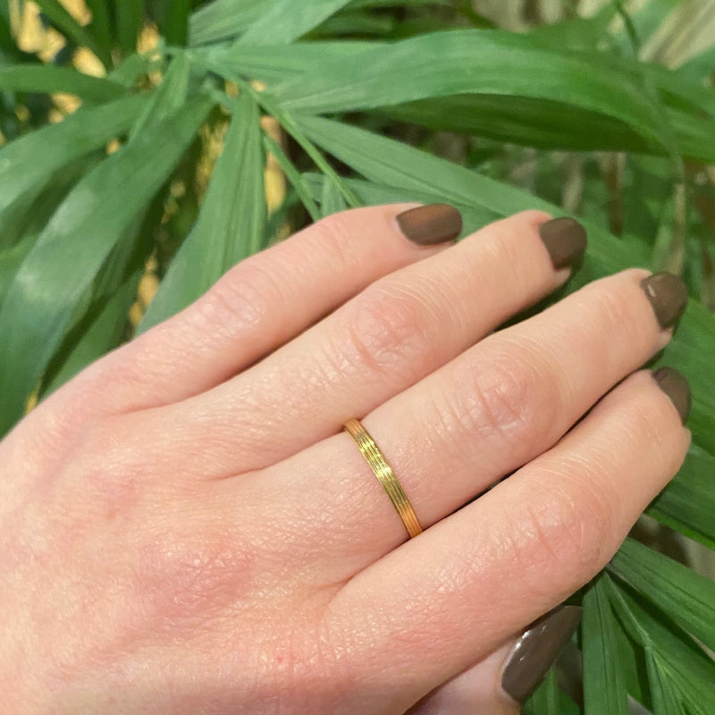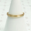 This slim vintage 14k gold wedding band has a triple groove detail and a mil grained edge. Wear it with an engagement ring for a sleek, modern look, or add it to your stack for some great texture and color. Circa 1940.