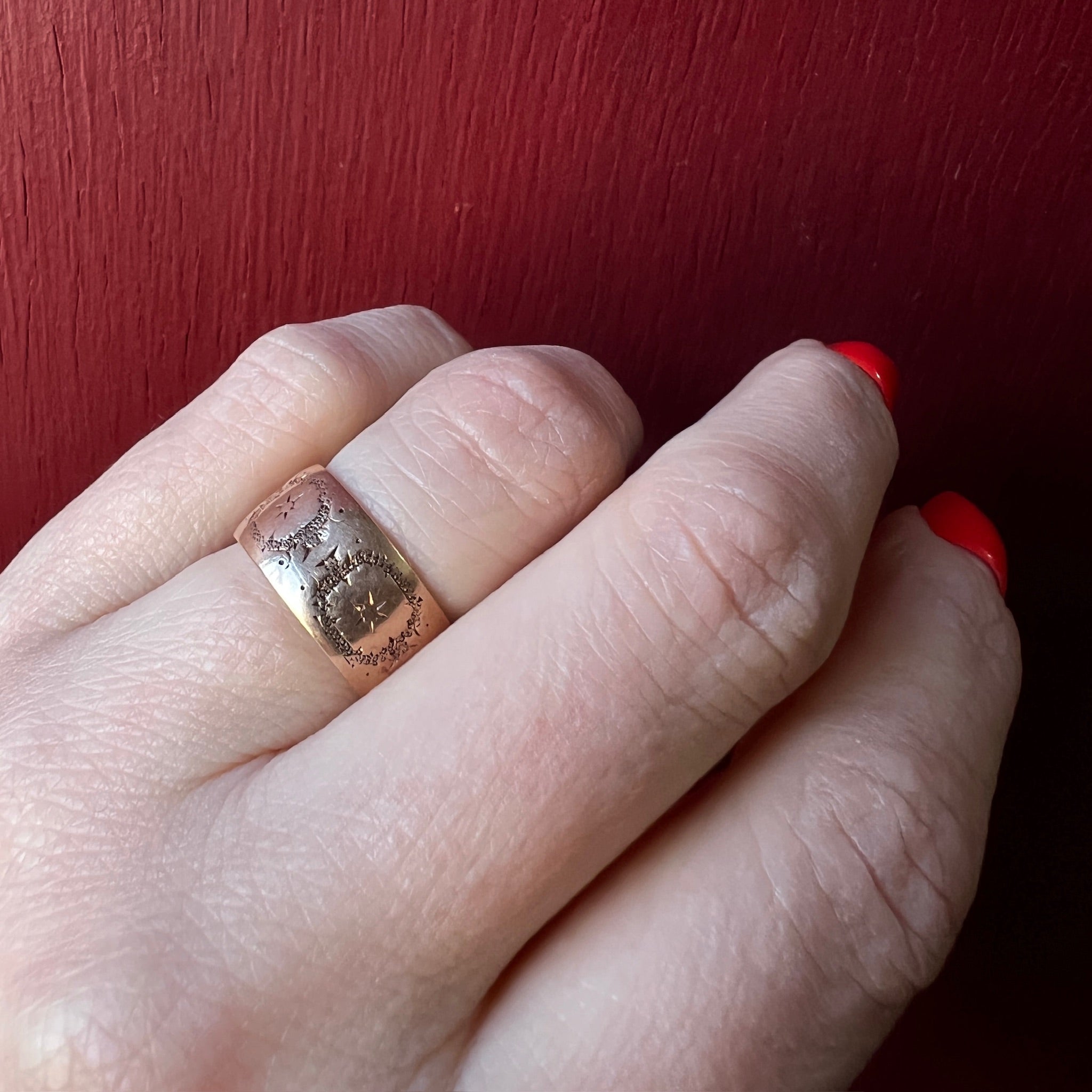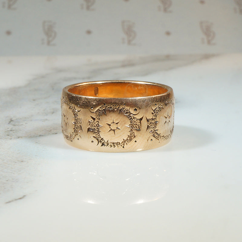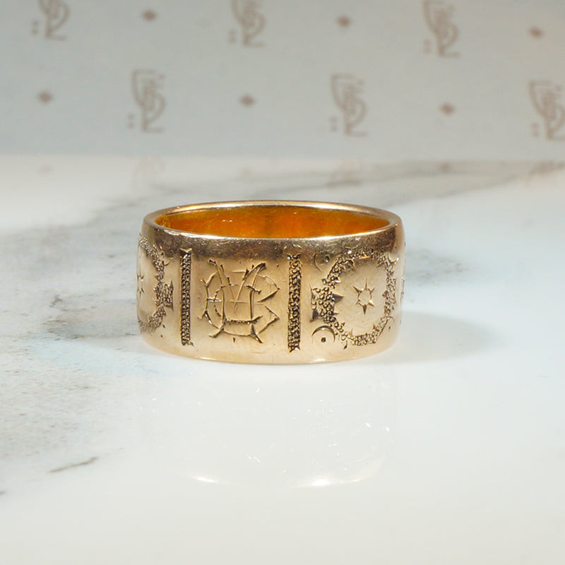 A delightful 14k gold Victorian cigar band, incised with a series of haloed stars. The pattern is interrupted with the engraved monogram "BMC" or maybe "CMB." In the 19th Century, "cigar band" referred to this popular style of wide, thin, decorated bands. There was much variety in available designs, and this is a very pretty, personal example. Circa 1880.