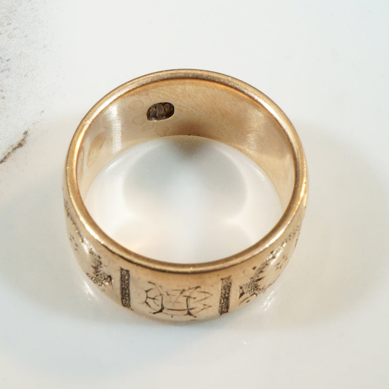 Details.....This ring is a size 6.25. It cannot be sized. The band measures 8.2mm wide. Please remember that a band this wide will fit more tightly. In Very Good Antique Condition. You should always expect some wear on vintage and antique jewels, we consider it part of the charm.