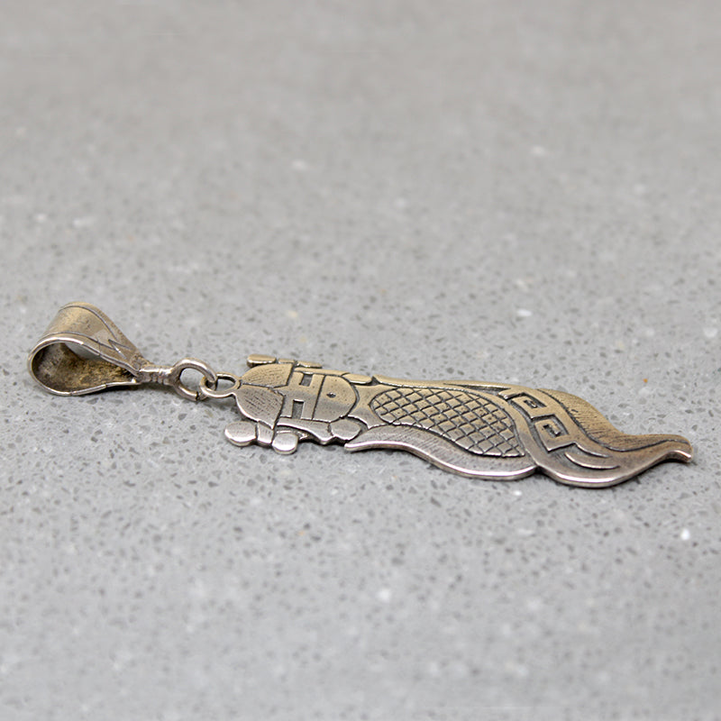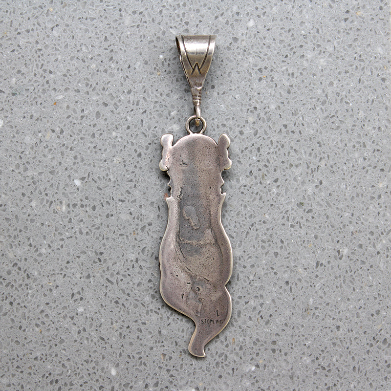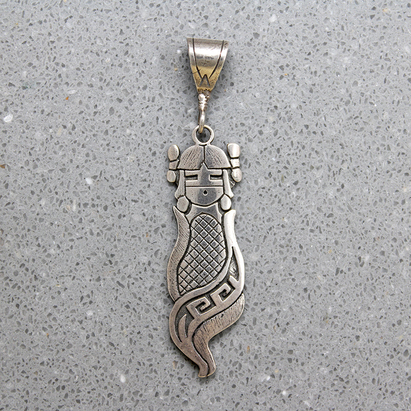 An exceptionally pretty Corn Maiden pendant in sterling silver. There is something special about her, with her lovely face and the squash blossom hairstyle worn by unmarried Hopi women. She was created using the Hopi overlay technique in which a carved layer of polished silver is applied to a layer of oxidized silver, creating a wonderfully graphic effect of contrasting textures. The Maiden has a large decorative bale that is the ideal size to accommodate a leather thong or strand of beads. Circa 1980.