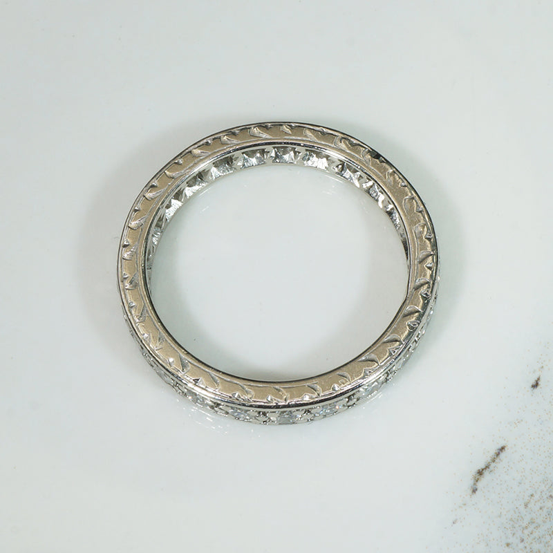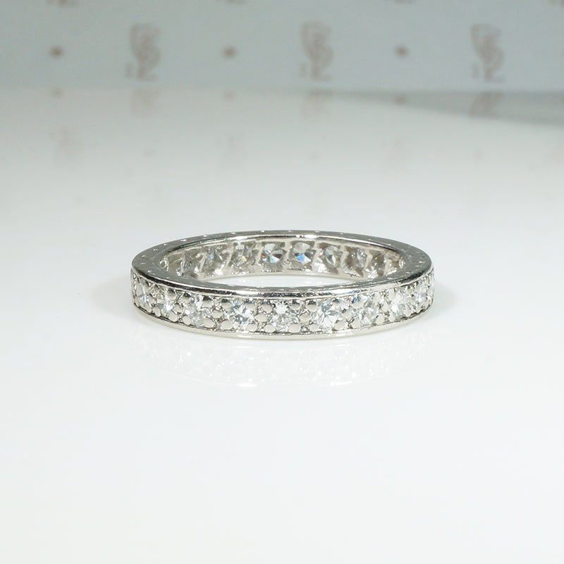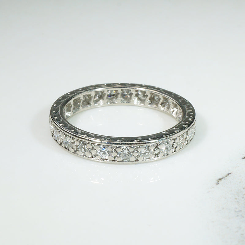 Nothing says luxury like a diamond and platinum eternity band. This Art Deco classic is set with approximately .75tcw of glittering diamonds, all bead set around the platinum band. Engraved flat edges border the stones. The internal ajouring is elegant and precise, a subtle detail that sets this band apart. Perfectly balanced to pair with your vintage engagement ring. Circa 1920.