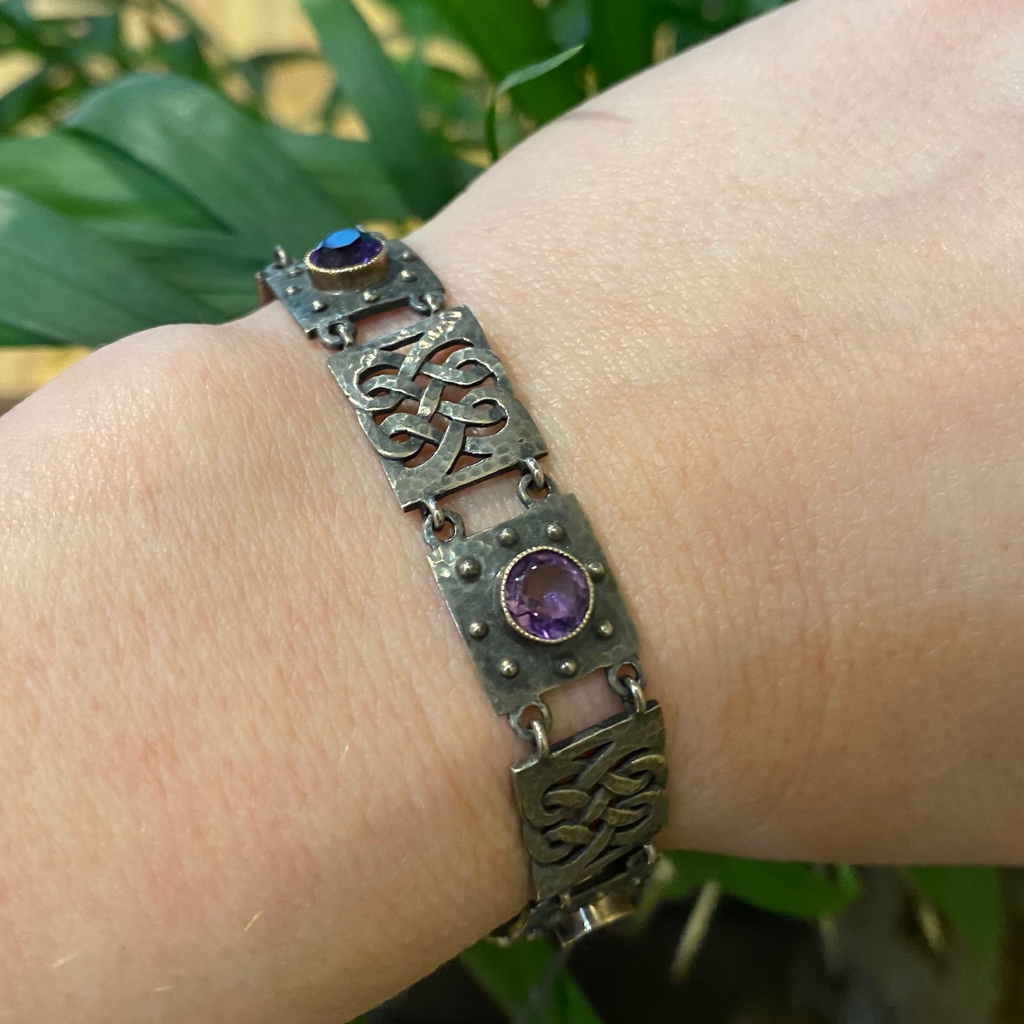 This signed bracelet is in the Celtic Arts and Crafts style that Murrle Bennett was well known for. The links alternate between intricately woven Celtic knots and plaques set with rich natural purple amethysts. There is a hammered texture over the whole of the bracelet. Complete with the original clasp and safety chain, this piece is in excellent condition. Circa 1908.