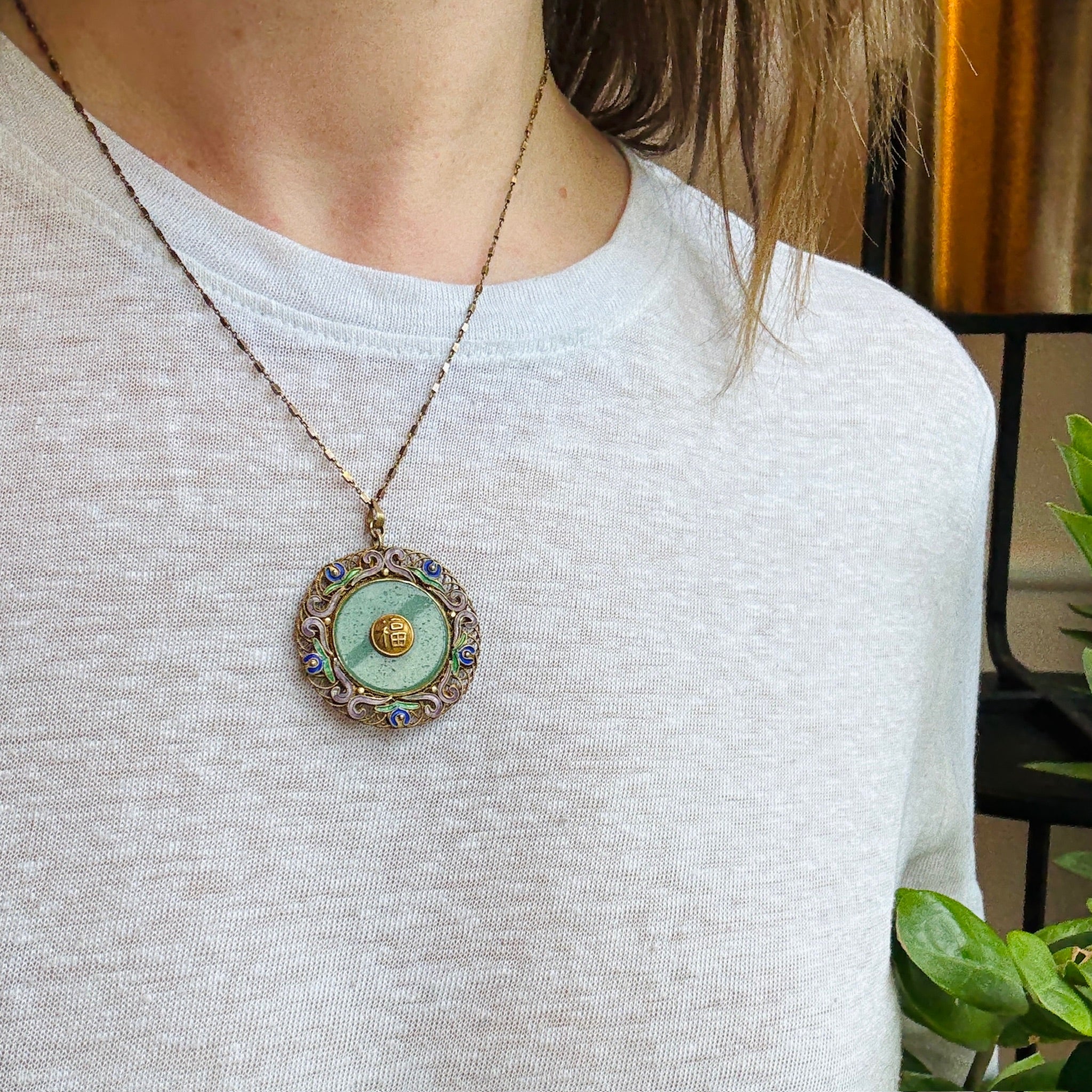 A ornate Chinese pendant featuring a disc of aventurine, haloed in filigree and enamel. Each side of the disc has a different golden Chinese character set in its center. Enamel flowers in shades of blue, purple, and green are applied to a ring of lacy silver gilt that frames the stone. The pendant hangs on a fancy link silver gilt chain. Circa 1970.
