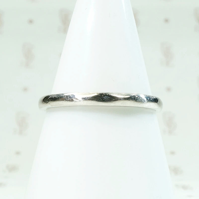 A mellow platinum wedding band with very soft bevels or facets. The band has been worn to a pleasing smoothness, evidence of a lifetime of love. The interior of the band is marked "Bs." Circa 1940.