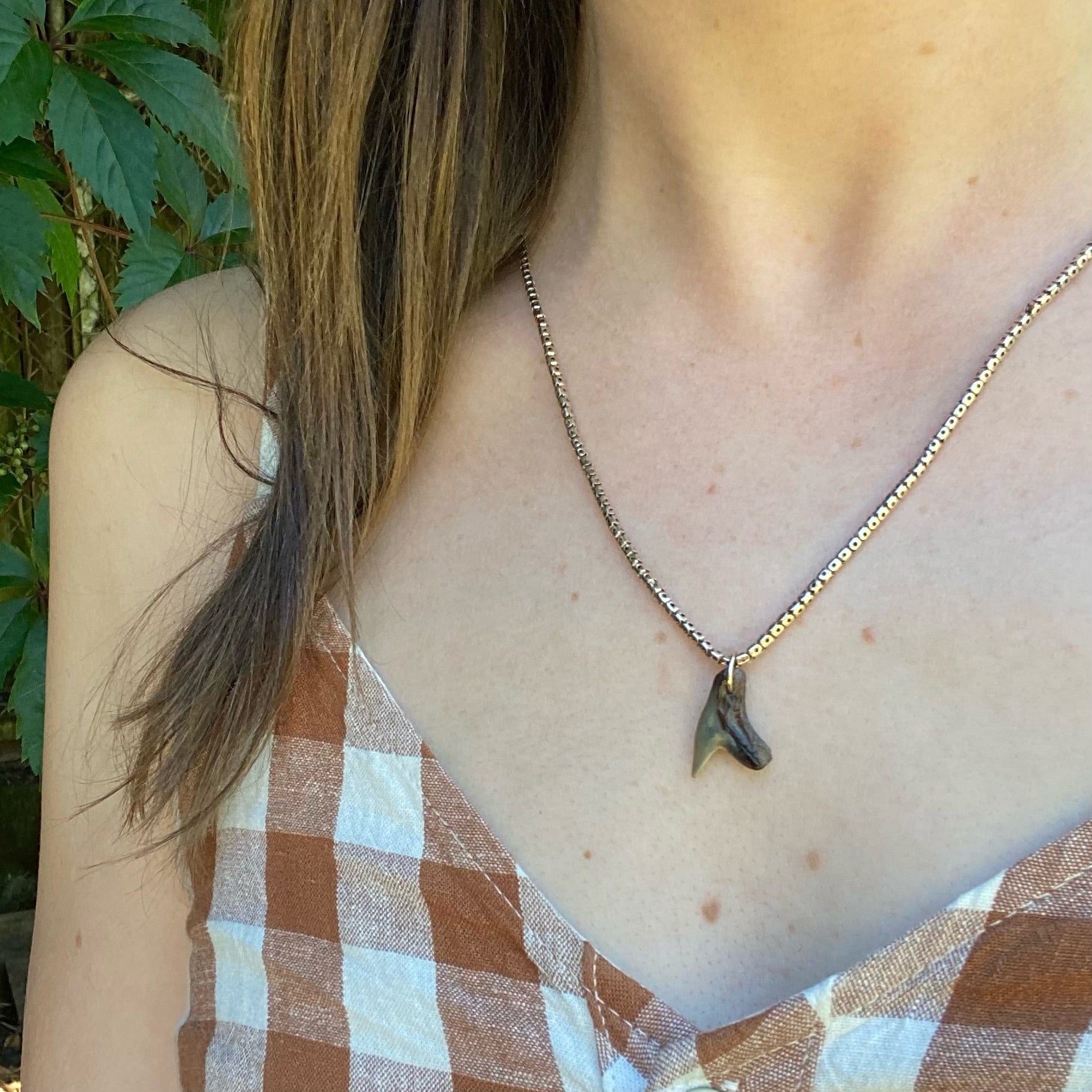A fierce shark's tooth charm. The tooth is pierced by a 14k gold jump ring, making it easy to attach the charm to anything you like. This piece has an intense, talismanic aura. What is more powerful than a shark, or more mysterious than the deep ocean?