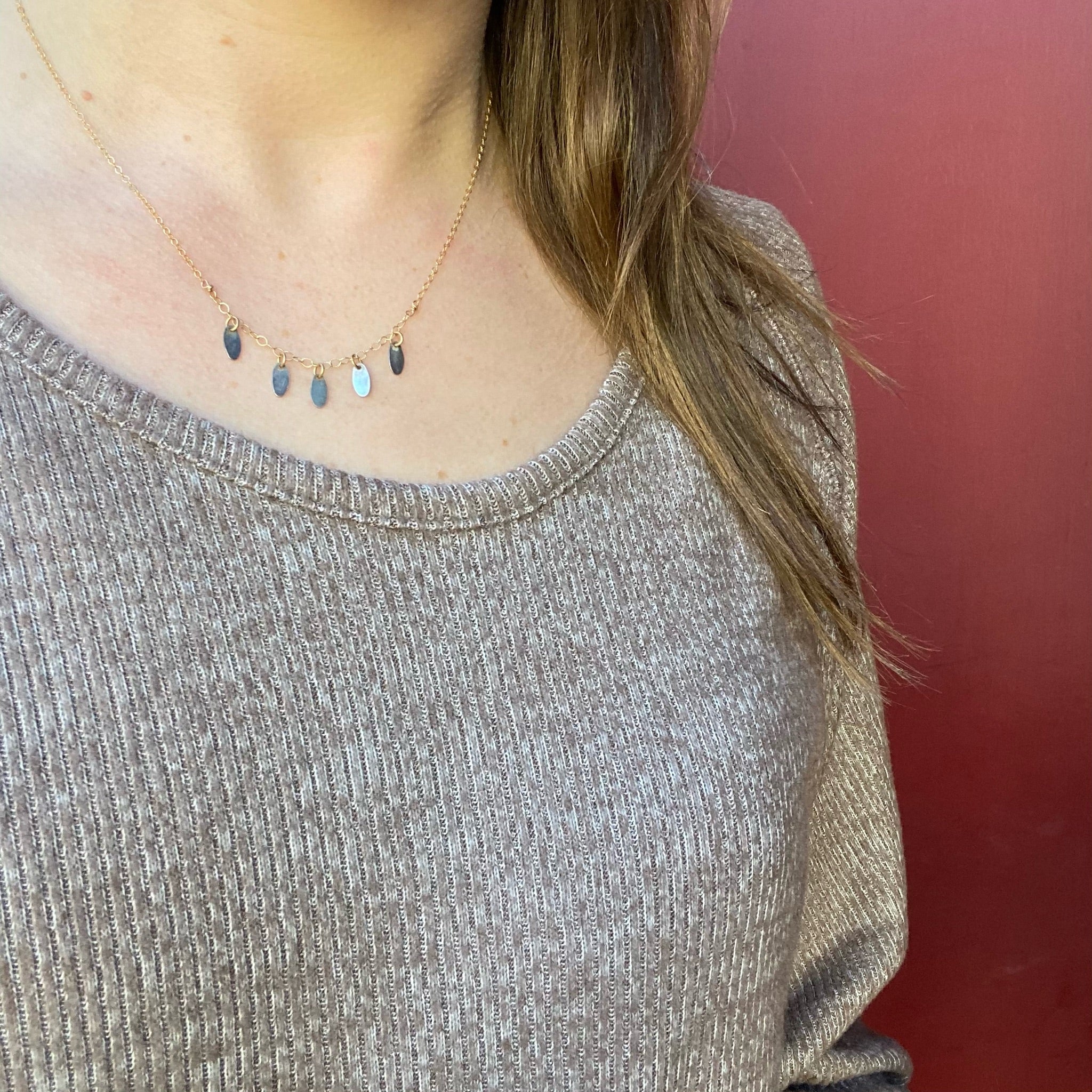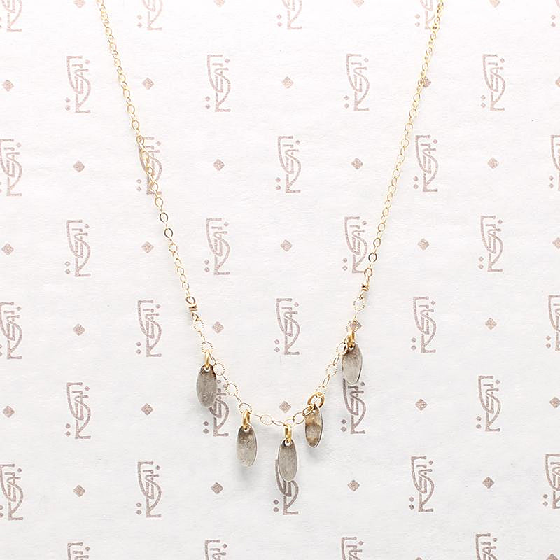 A pretty artisan festoon necklace made of vintage hand forged silver petals dangling from a segment of textured gold filled chain. The piece is finished with a fine gold filled cable chain. This necklace has lovely texture and a fun fluttering movement. The mixed metals make it so versatile, it will go with everything. Vintage components in a modern configuration...the best of both worlds.