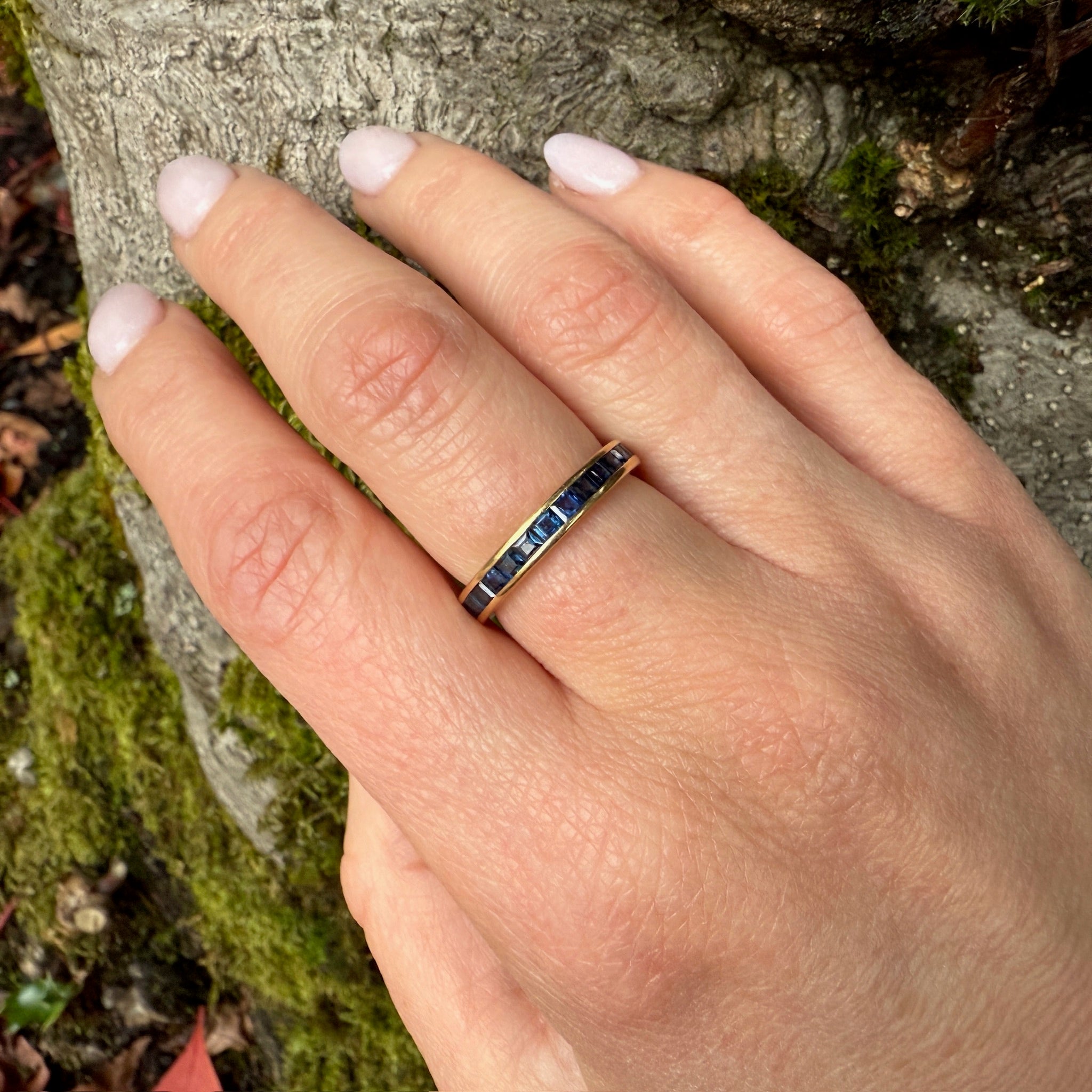 Rich yellow 18k gold eternity band with deep blue square cut sapphires set round it. This band would make a wonderful addition to your stack or add a sapphire blue pop to your engagement ring. Circa 1930, light wear to the sapphires.