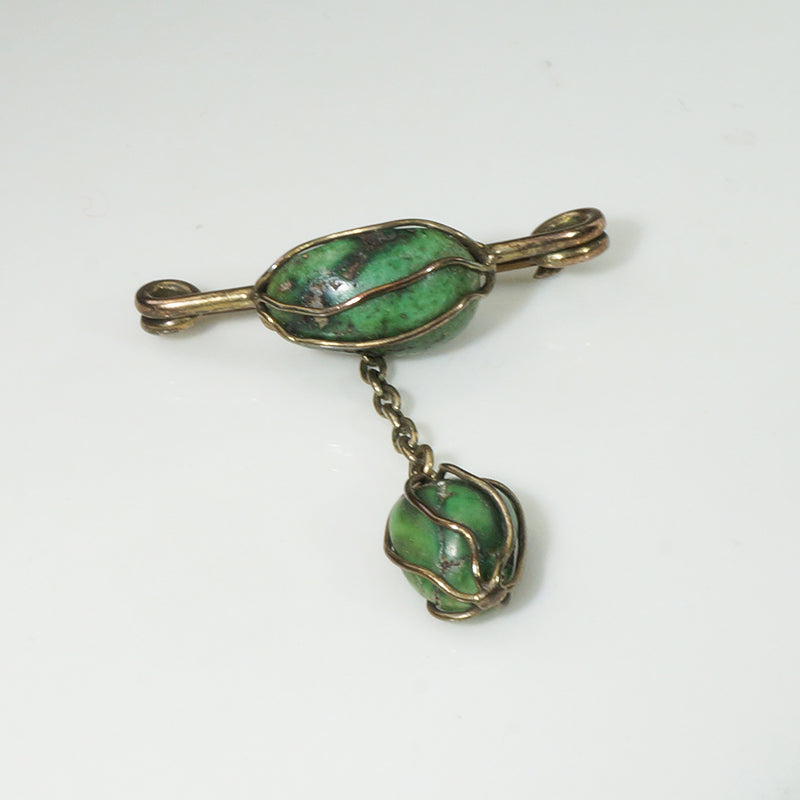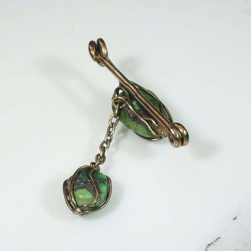 A 9k gold safety pin is embellished with wire-wrapped turquoise. One oblong chunk of turquoise is wrapped with multiple strands of curving wire and attached to the pin. A second piece of turquoise, also wire-wrapped, is suspended from a short segment of chain. This brooch has a naive charm that recalls the aesthetic of the Arts & Crafts movement. Use this pin as a decorative brooch, a sweater clip, or a clothing closure of any kind. Circa 1890.